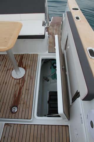 Dispone de paso directo a la plataforma de baño, con escala y ducha, y no faltan las regalas de teca con cañeros y gateras para poder colgar las defensas. La teca del piso es opcional y la nevera secundaria va ubicada en el módulo del asiento del piloto y acompañante.