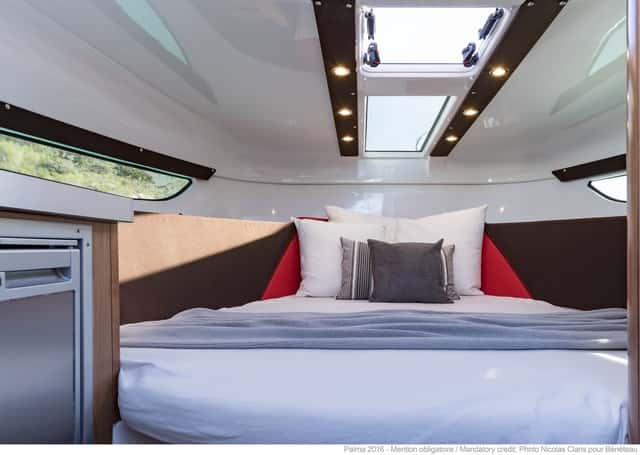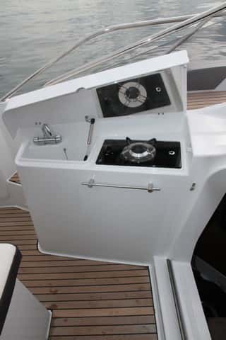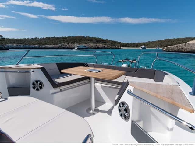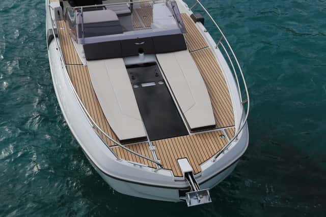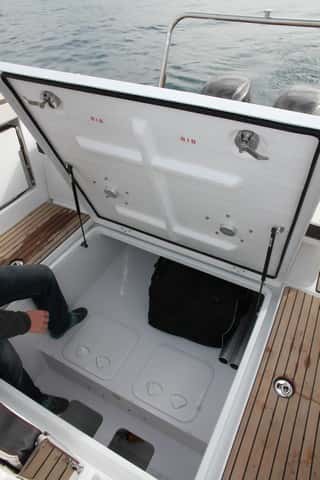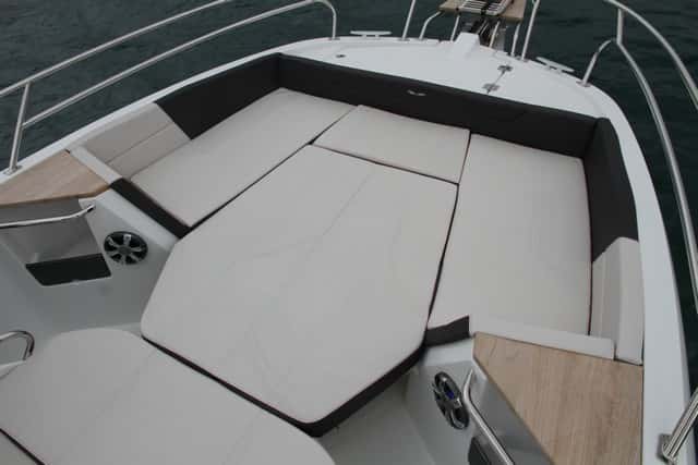 Por su parte, la SpaceDeck ofrece una proa abierta realmente interesante, con cofres bajo los asientos que se pueden transformar en una superficie única. Esta parte del barco es un punto fuerte, ya que se puede formar un solárium y, si se desea, se puede también montar una mesa para una segunda dinete, que complementará la de popa.