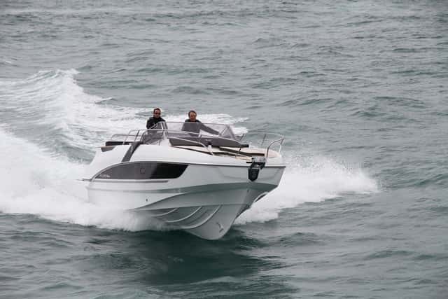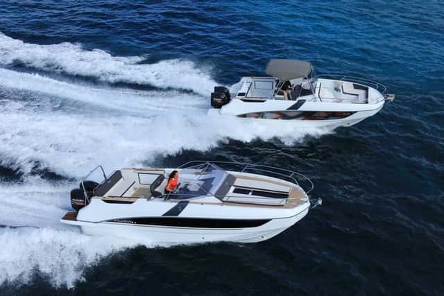 A estas ventajas se añaden las prestaciones de motorizaciones de los Suzuki, en un caso con 2×250 Hp y en el otro con 2×200 Hp. Las diferencias entre ambas embarcaciones son inapreciables, ya que el peso no determina variación alguna. Sin embargo, los 100 Hp de más instalados en la SunDeck se dejan notar, especialmente en la velocidad punta, que es de casi cinco nudos superior a la de la SpaceDeck. Navegar a casi 43 nudos con un barco de esta eslora es una sensación inmejorable, ya que el barco se comporta realmente bien con mar picada. La SpaceDeck mantiene un régimen de crucero de unos 28 nudos y acelera de 0 a máxima en 15 segundos. Sale en planeo en solo 5 segundos. Marcas que son propias de una deportiva. En cuanto a su comportamiento hay que decir que es más que notable, ofreciendo una conducción suave y con gran respuesta. También hay que decir que las condiciones de navegación eran mejores que las de la prueba con la SpaceDeck, con una mar más comprometida, con marejadilla y más viento.