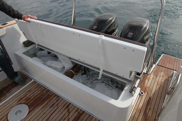 El banco de la SunDeck esconde un buen cofre de estiba y se puede plegar para formas un pequeño solárium que complementa el de proa.