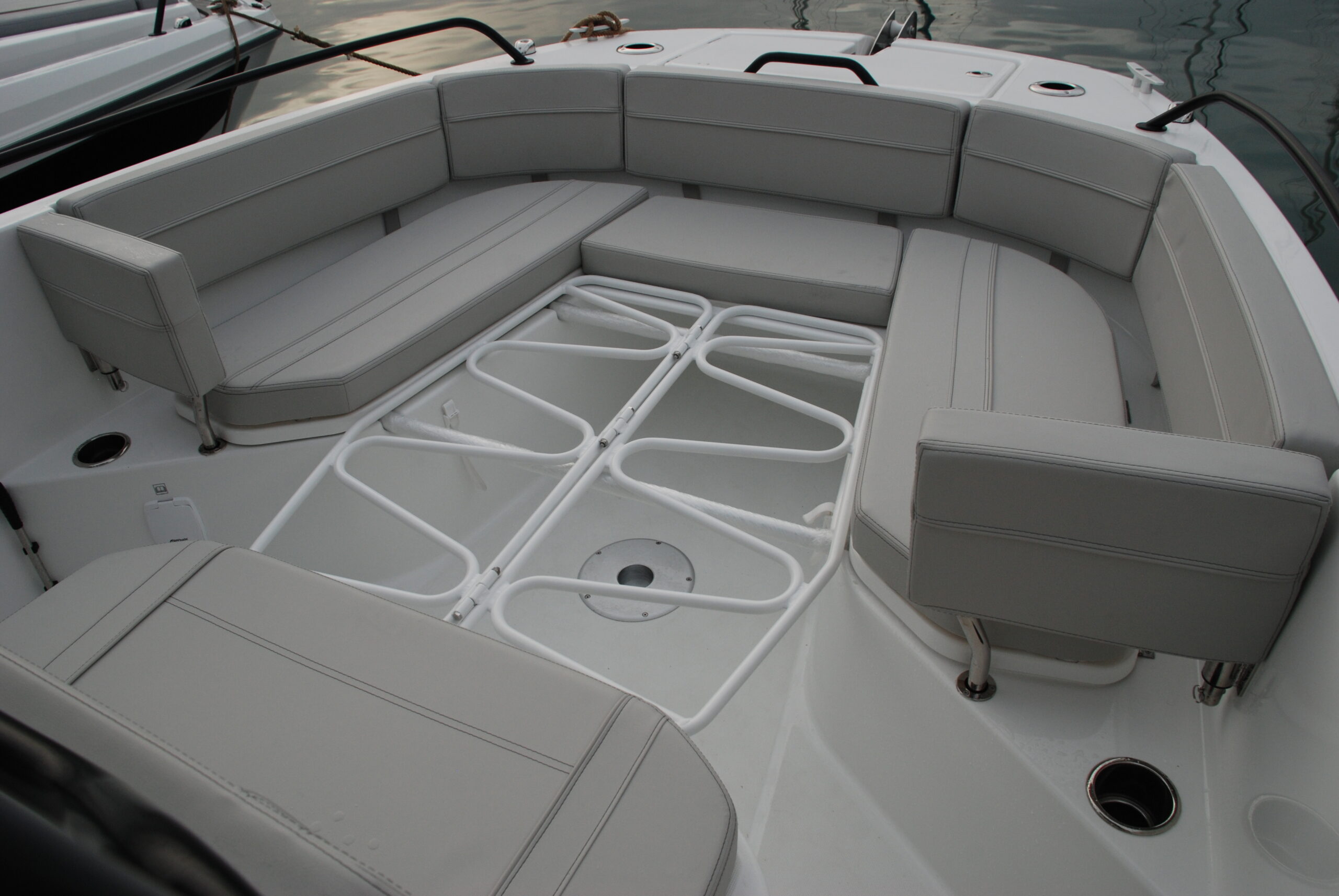 Cuando la bañera no se configura para la pesca, los asientos que la rodean la convierten en una confortable área de estar —a cuyo efecto se ha dispuesto también de un pie para el soporte de la mesa central— y que puede convertirse en una zona de solario.