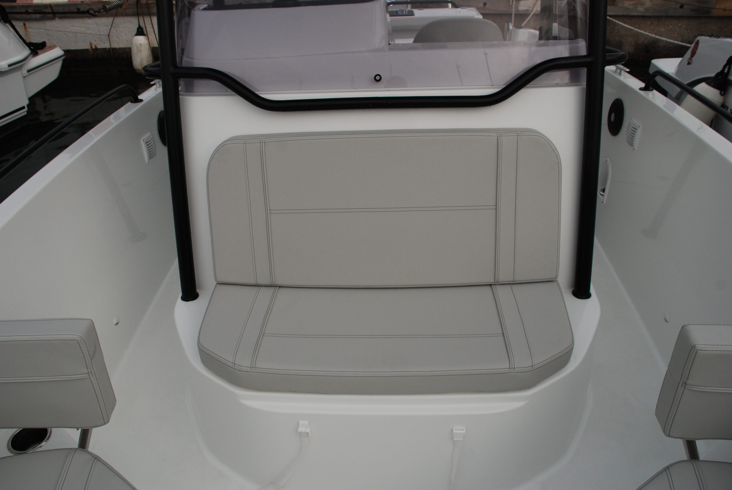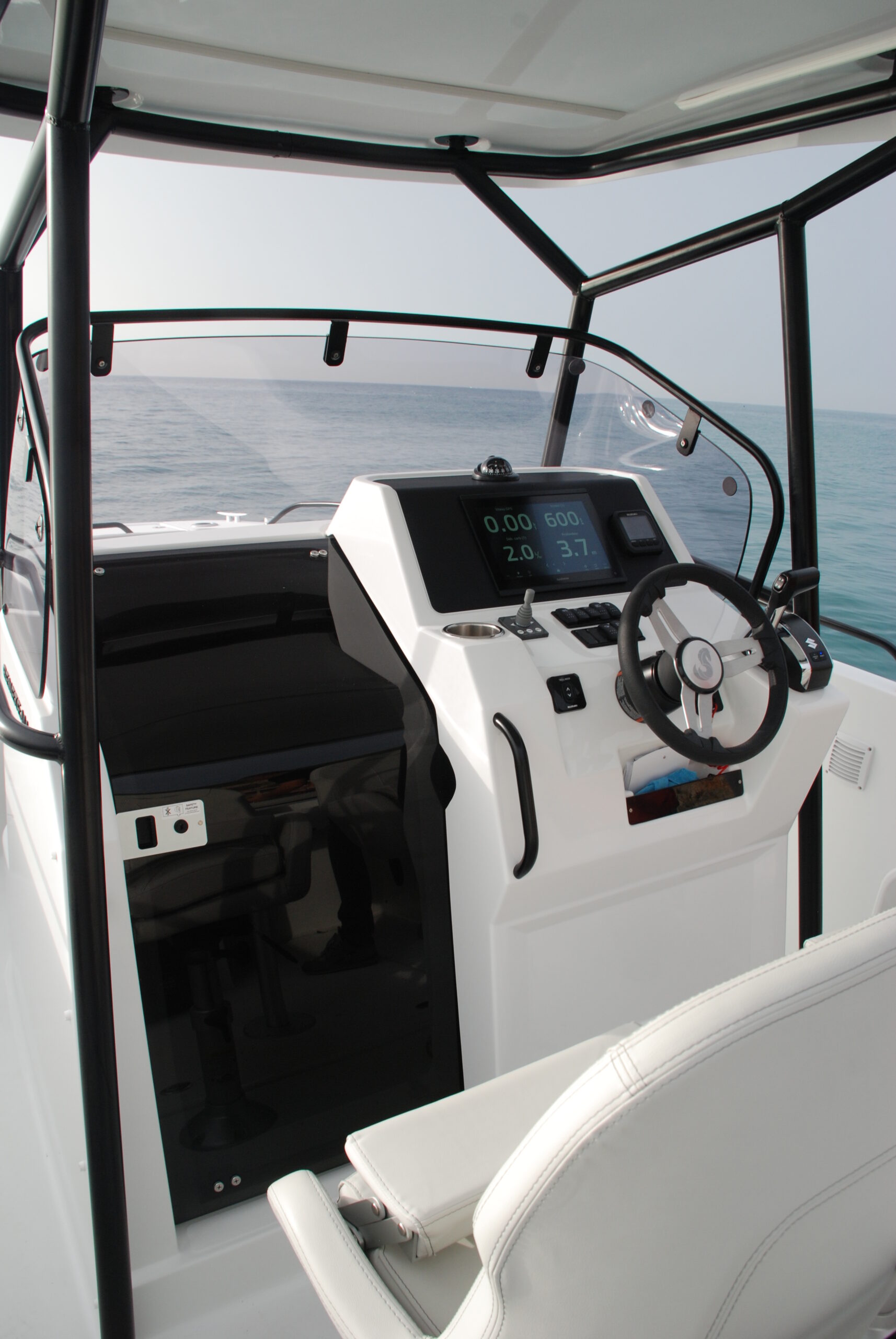 La consola es amplia, con los mandos del motor bien posicionados y suficiente espacio para la instrumentación y la pantalla de navegación del paquete de electrónica Garmin. No se han dejado detalle, de forma hay un conveniente agarradero para que el acompañante pueda sujetarse, posavasos, cofre abierto para pequeños objetos, la base de los asientos se levanta para conducir de pie y —importante— el parabrisas es alto, protege los lados y esta reseguido en su borde superior por un pasamanos de inox también negro que ofrece sujeción estando de pie. No se le puede pedir nada más a una consola central en este tamaño de walkaround.