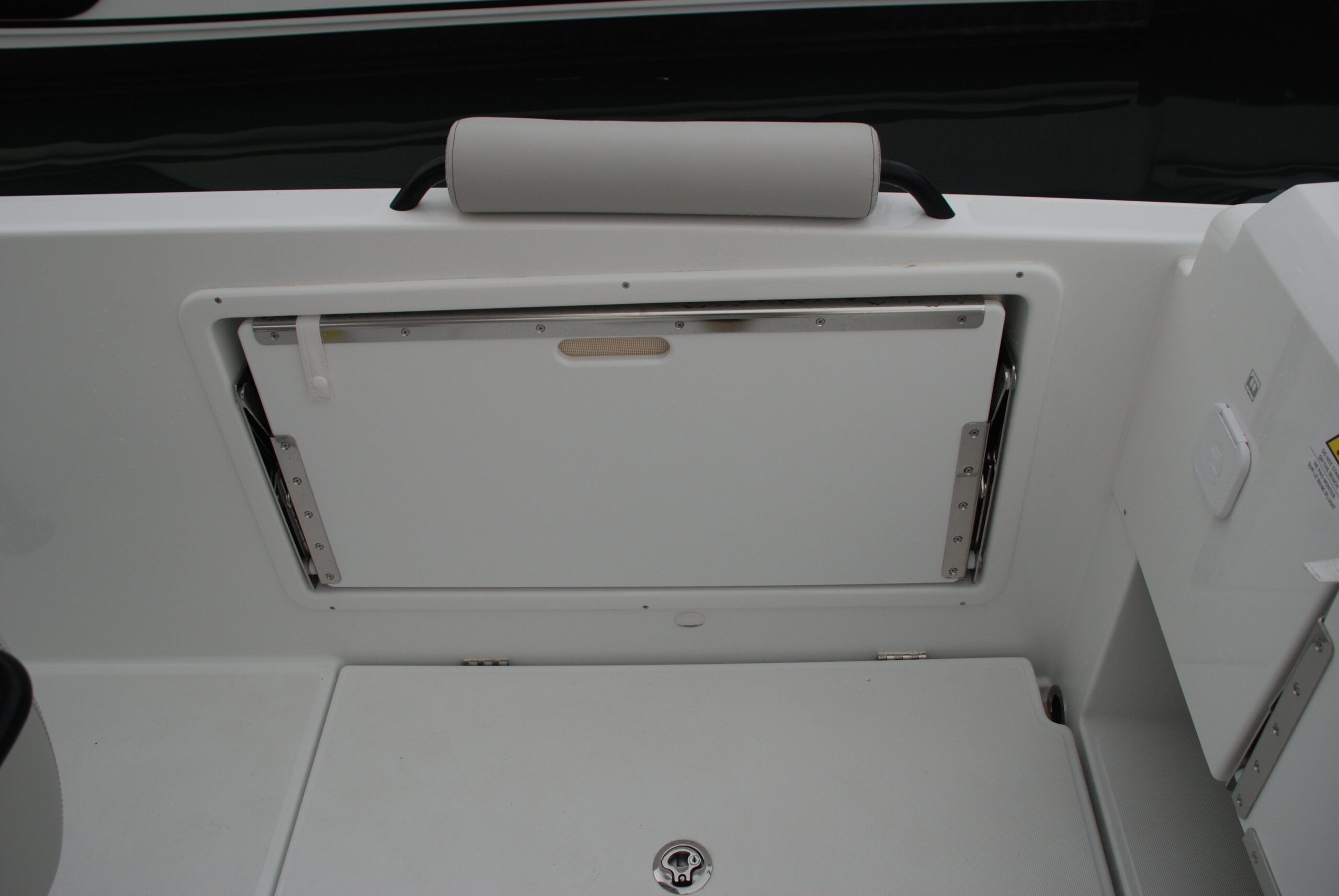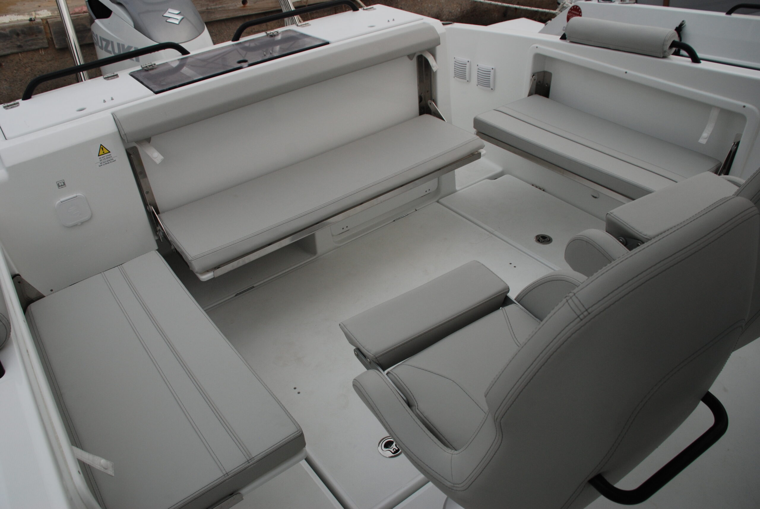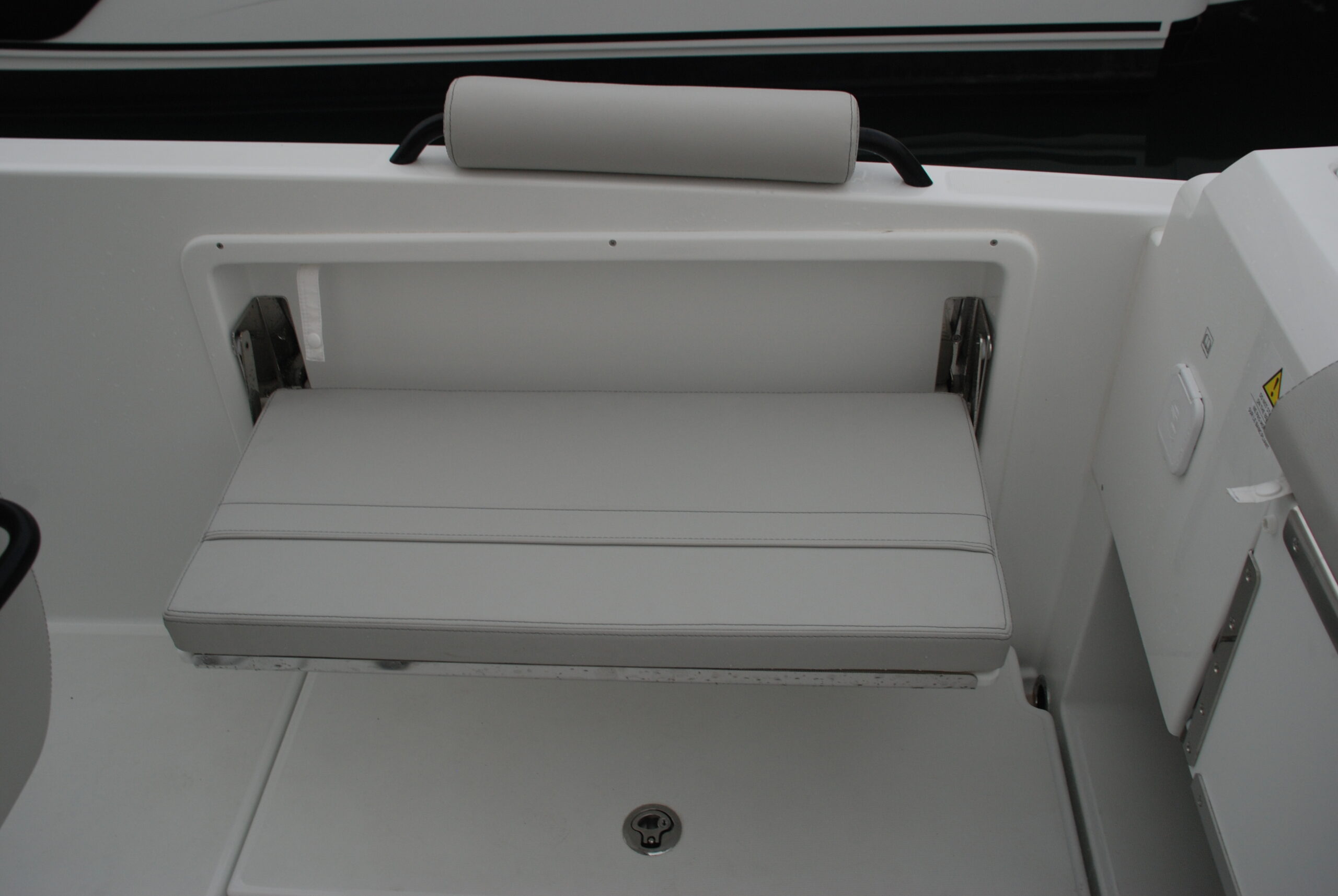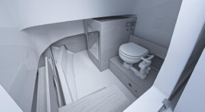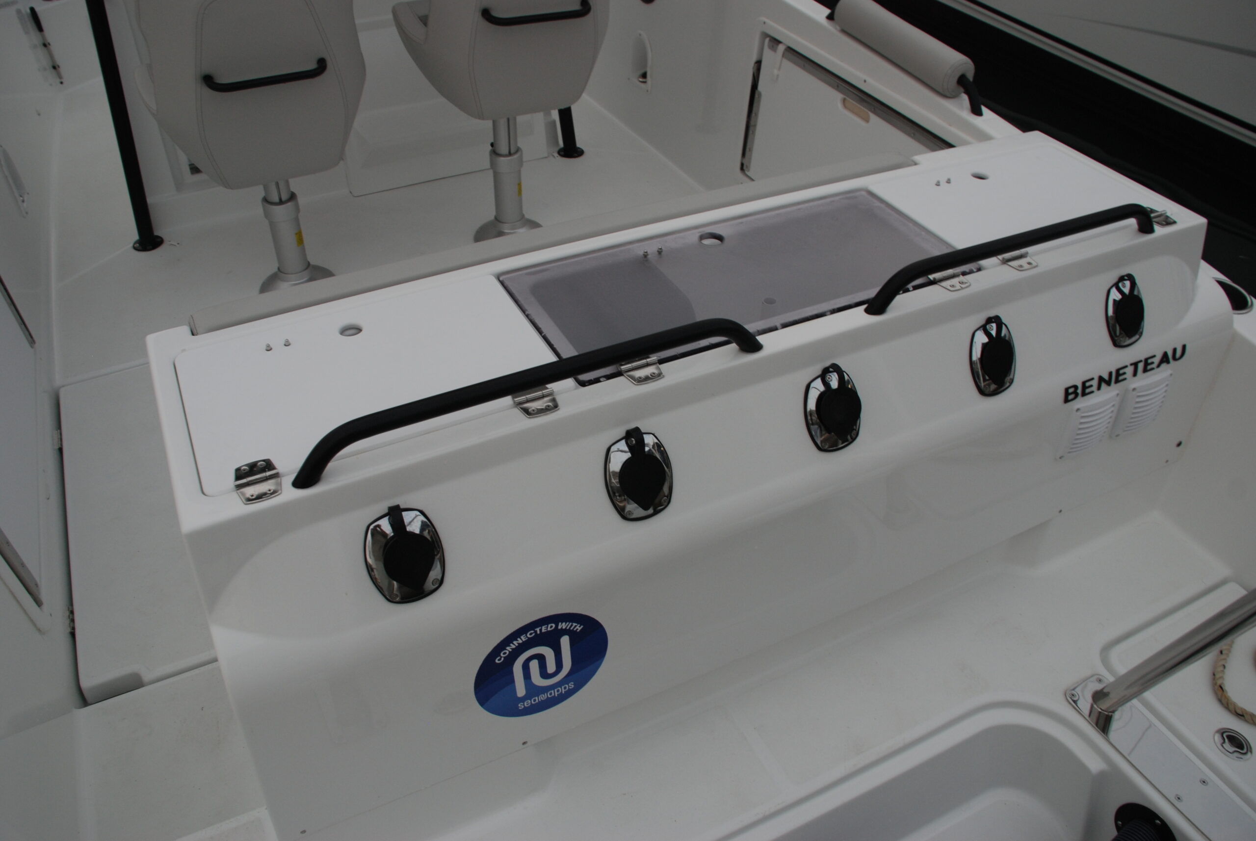 El diseño ha prestado atención a la estiba, que suele ser mucha en los barcos de día con un programa de usos tan diverso, y ha dispuesto tres cofres en el plan de la bañera, el central y más grande de los cuales alberga las baterías. También existe la opción de instalar en popa un mástil para esquí acuático.