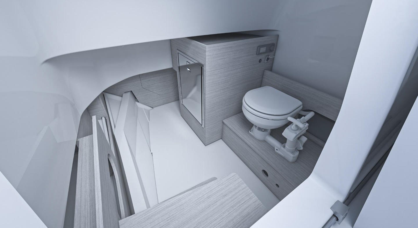 La cabina interior, a la que se accede a través de la puerta deslizante a babor de la consola de gobierno es esencial aunque dispone de una buena altura de 1,62 m. Hay espacio para incluir una nevera y un wc marino como opción o bien una litera para niños. No se requiere nada más en un barco de este programa, en el que la cabina será usada mayormente para depositar equipamiento, las bolsas de los invitados, el material de seguridad y los chalecos salvavidas, y los efectos de baño y los destinados a juegos, buceo  y deportes acuáticos.