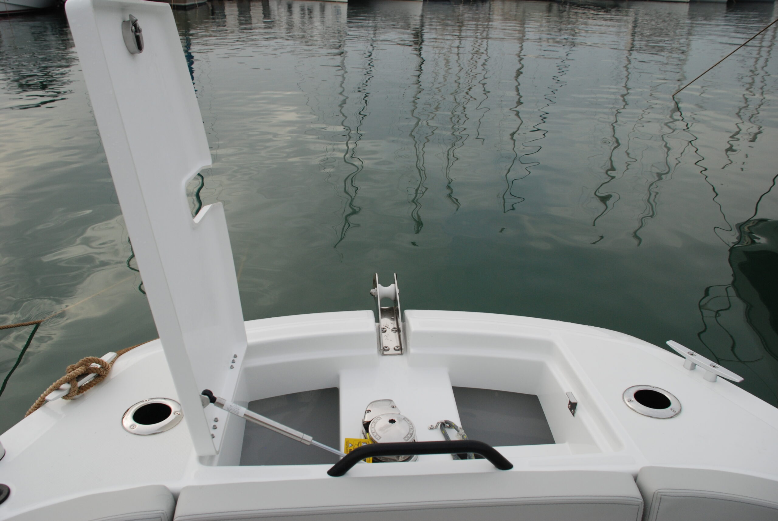 La proa es abierta y ofrece una plataforma plana para facilitar el acceso a bordo, bajo la cual se esconde el molinete de ancla y el equipo de fondeo.