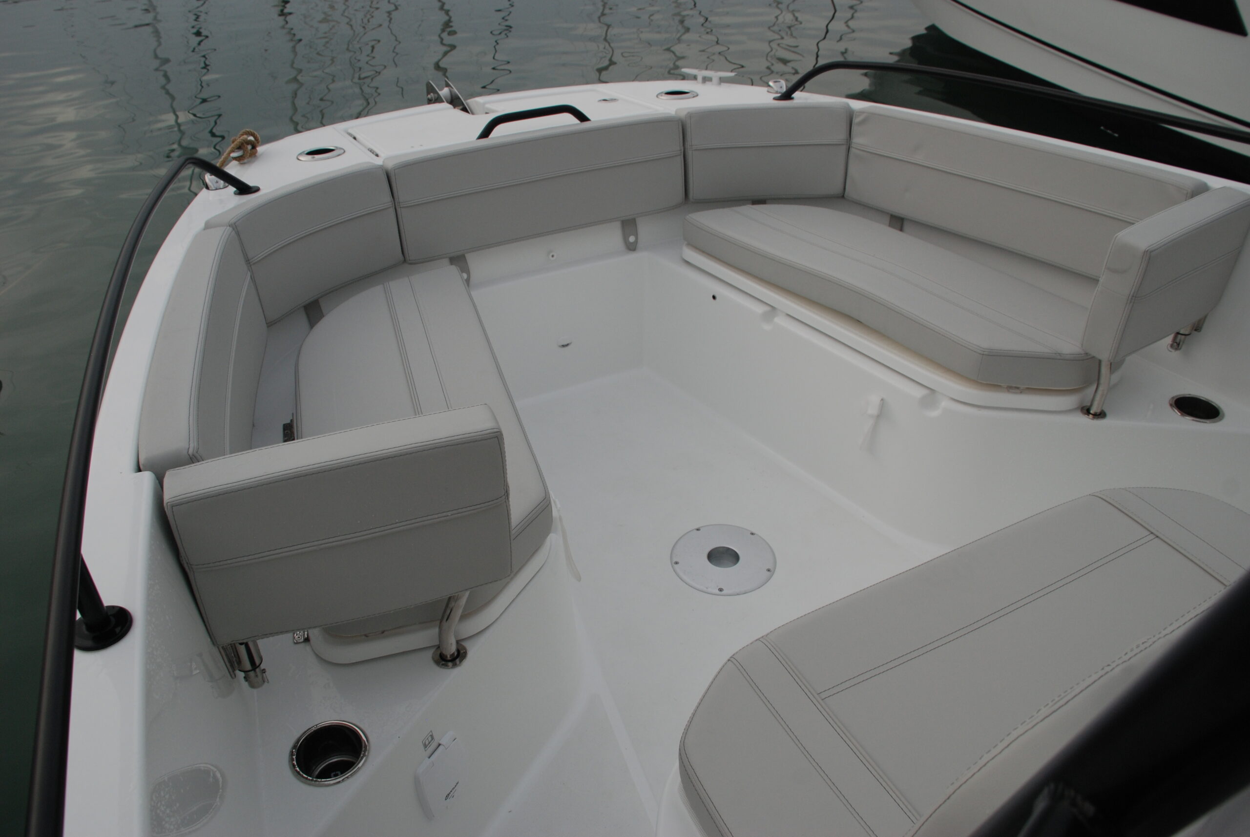 La modularidad y adaptabilidad a diferentes usos que observamos en la bañera se hace más evidente si cabe en proa. Aquí los bancos laterales y central frente a la consola permiten convertir este espacio en un segundo solario o en una conveniente zona de estar en la que seis personas pueden reunirse en torno a una mesa. Hay que destacar que los respaldos de toda la zona están acolchados, que hay  cofres de estiba bajo los asientos y que pueden montarse respaldos móviles en las banquetas de las bandas para mayor comodidad.