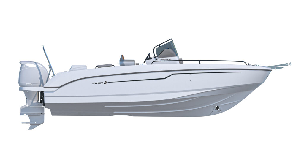 La Flyer 8 SPACEdeck es la última generación que llega al mercado de este modelo de la gama Flyer presentado en 2018. Sobre la base del mismo casco que el anterior para mantener la eslora por debajo de los siete metros, modifica sin embargo totalmente la cubierta para hacerla más polivalente y acorde a los diferentes usos que contempla su programa ya sean salidas de día, jornadas de pesca o deportes acuáticos.