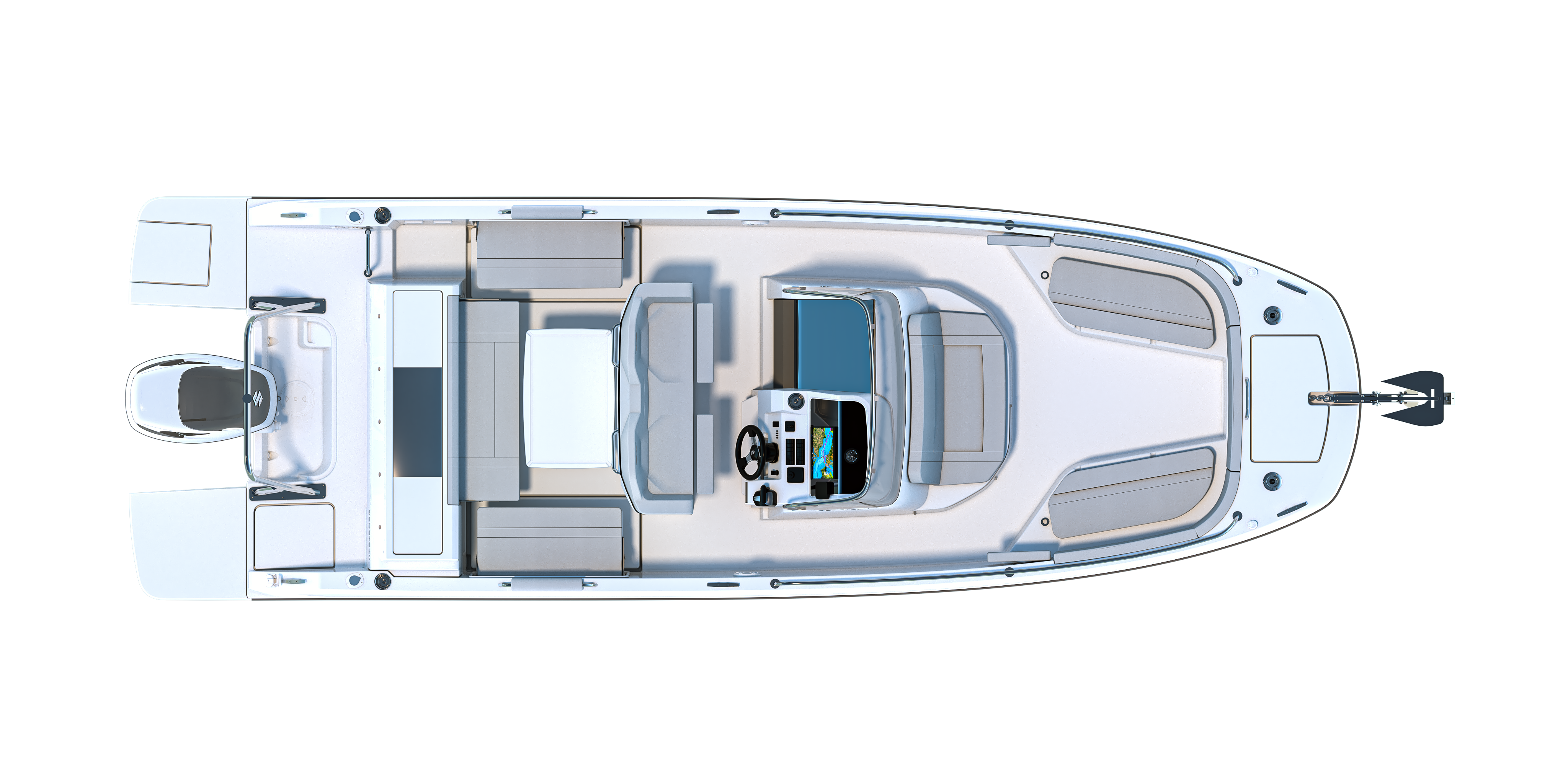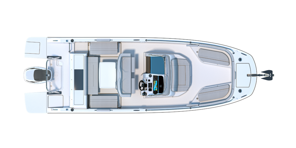 Como en todas las Flyer, la consola es central y la cubierta totalmente plana permiten circular alrededor del barco, desde las plataformas de popa hasta la proa, con total libertad y seguridad, gracias también a las bordas altas y los sólidos pasamanos de inox negro que recorren toda la borda. Algo que agradecerán no solo los aficionados a la pesca a la hora de moverse por cubierta, sino las familias con niños por la seguridad extra que aporta tanto en navegación como en fondeo.