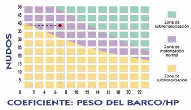Este gráfico nos permite apreciar si la potencia del motor Suzuki DF 300 APF de 300 Hp de la Flyer 8 SPACEdeck es la adecuada o si, por el contrario, está por encima o por debajo de la considerada óptima en función del coeficiente peso/Hp y la velocidad máxima alcanzada.