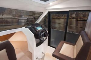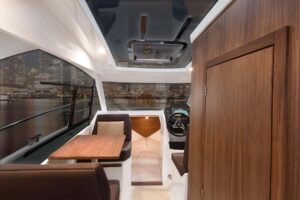 El interior, de madera de nogal, está rodeado de ventanas y un techo transparente con una escotilla practicable, dispone de una dinette con una mesa desplegable para dos personas, el puesto de pilotaje, el aseo con ducha y una cama doble en proa. En este modelo pueden instalarse diversos equipos de agua y sanitarios, de navegación, flaps y calefacción Webasto. www.galiaiberia.com