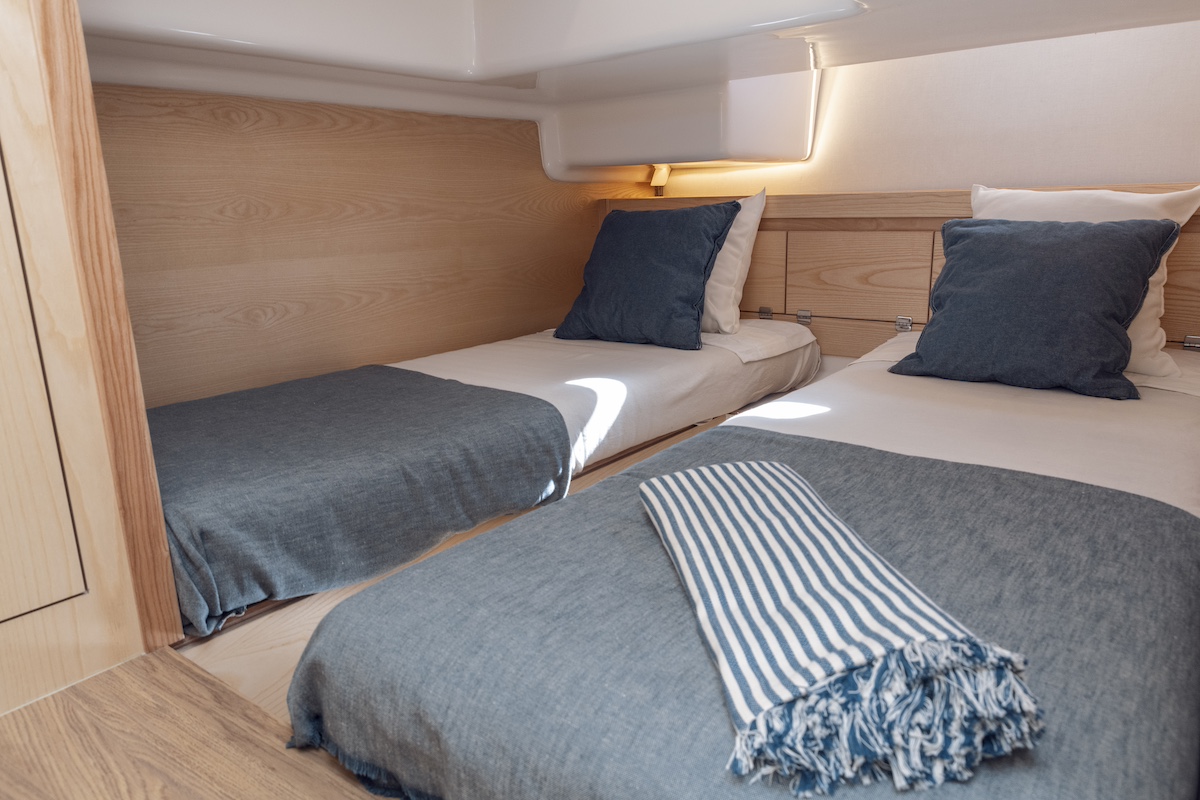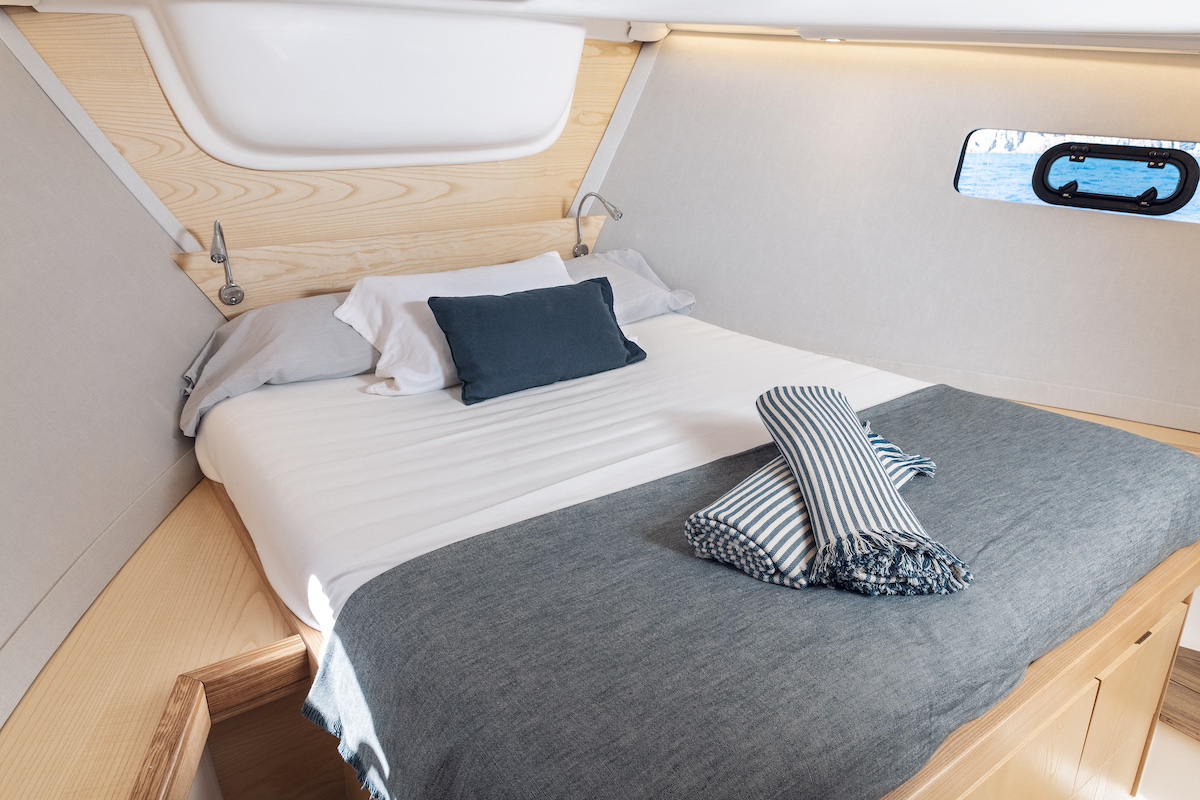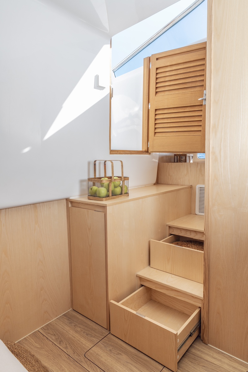Para sacar el máximo partido a sus interiores, con capacidad para cuatro o, incluso, seis personas, el equipo de diseño ha estudiado cuidadosamente el espacio disponible, aprovechando cada rincón con ingeniosas soluciones de diseño. Entre ellas destacaremos las escaleras de acceso que ocultan cajones y espacio de estiba o las puertas correderas de los camarotes.