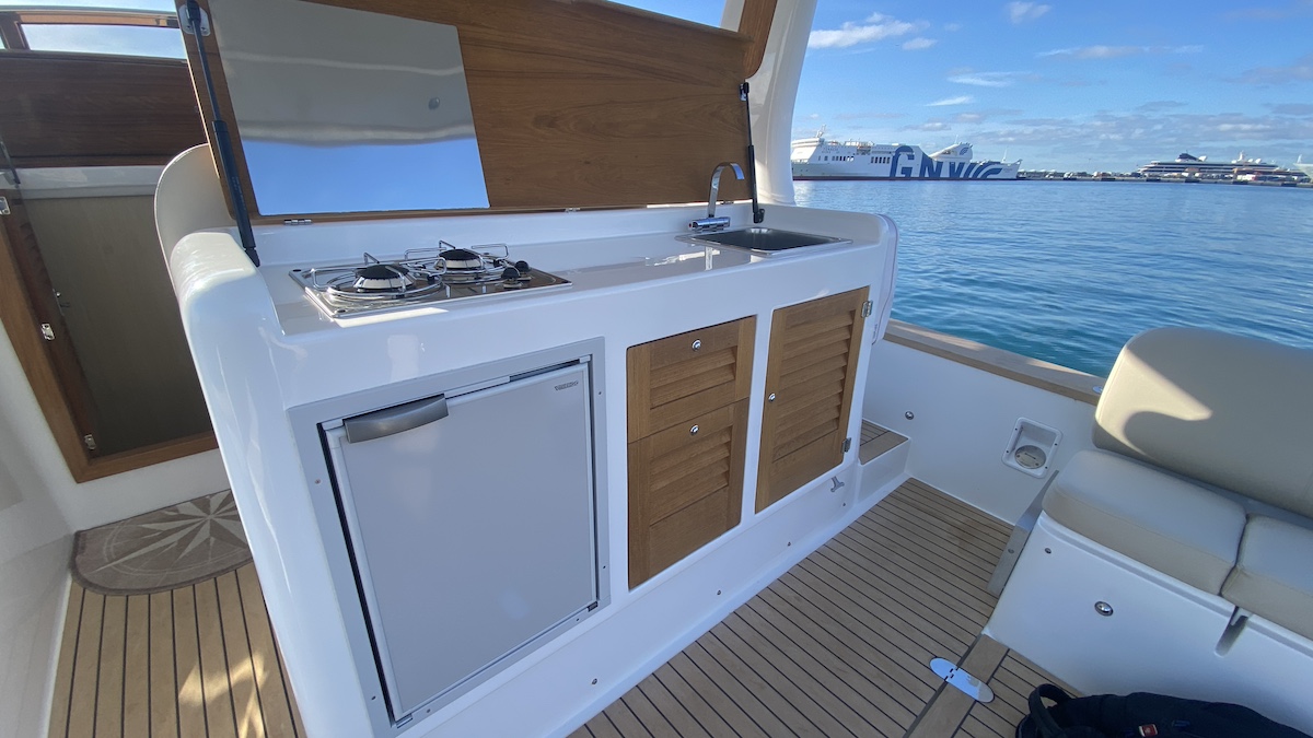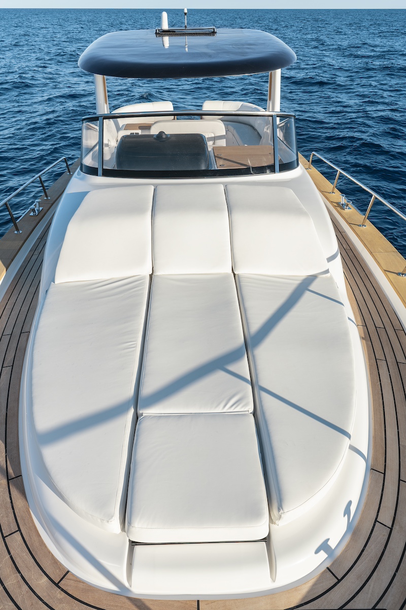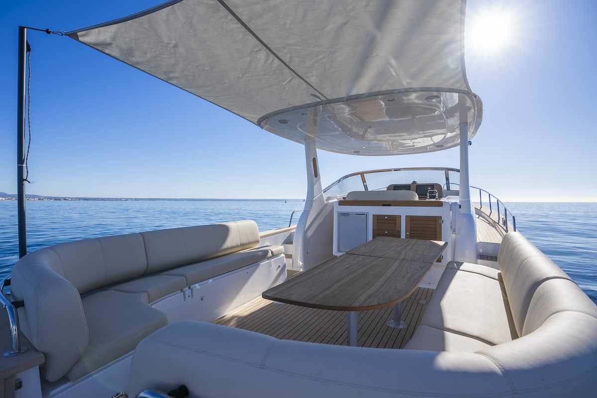 Su popa ofrece dos opciones: grandes bancos a ambas bandas o solárium con puerta lateral