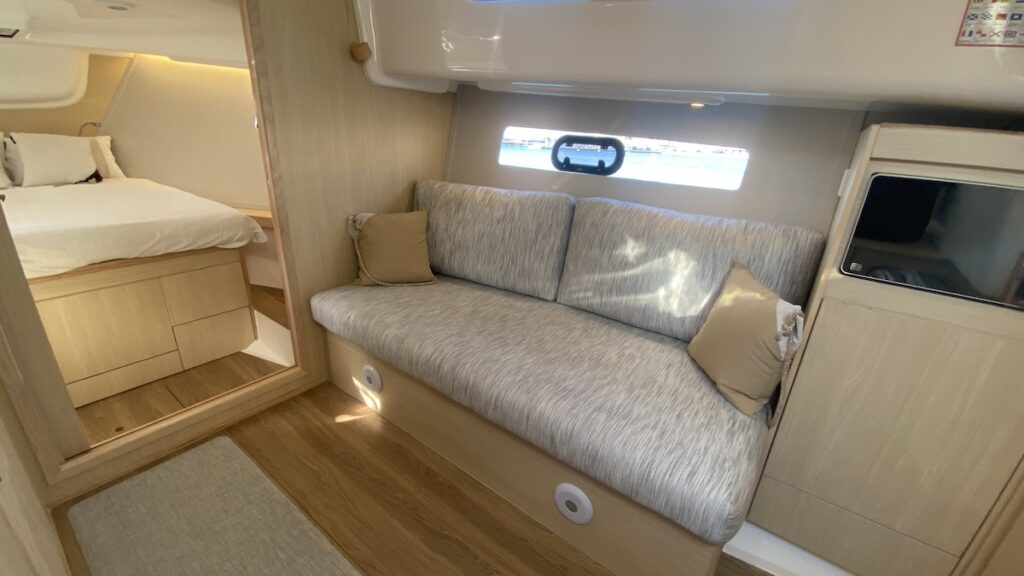 Tan solo entrar en la versión estándar de la Girbau G38 encontramos un sofá en la banda de estribor. En este espacio, opcionalmente se puede elegir entre una dinette o sofá cama convertible. En la banda de babor hay un completo aseo de gran altura. A popa, de origen, se ha optado por dejar la cabina abierta, aunque a petición del armador se puede cerrar mediante un mamparo. A proa, el camarote del armador queda ocupado por una cama doble, armarios y grandes cajones de estiba. Tanto los colores como las maderas y las tapicerías rematan el estilo mediterráneo de la Girbau G38.