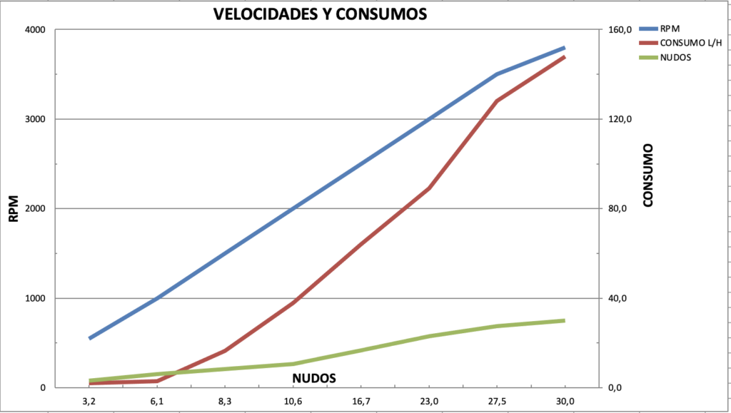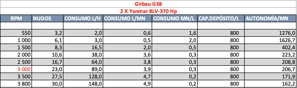 Coincidiendo con la celebración de la última edición del Palma International Boat Show, tuvimos oportunidad de probar una de las últimas unidades fabricadas por el astillero. Motorizada con dos Yanmar 8LV de 370 Hp cada uno, la Girbau G38 alcanzó una velocidad máxima de 30 nudos a un régimen máximo de 3.800 rpm y un consumo de 148 l/h entre los dos motores. El crucero más optimo lo encontramos sobre las 3.000 rpm a unos 23 nudos. En este caso el consumo se sitúa en 3,9 l/milla, con una autonomía que supera las 200 millas.