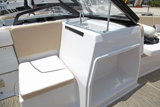 La bañera principal puede quedar rodeada totalmente por un sofá en forma de U, ocupando la banda de babor tras en puesto del piloto, la popa, y toda la banda de estribor. No es nada habitual, ya que el asiento del acompañante es un módulo fijo adosado al parabrisas, donde encontramos y un lavamanos. A media eslora a babor una puerta lateral abre totalmente la banda para facilitar el embarque. Aquí encontramos el herraje para montar el pie de la mesa de la diente que se puede formar en la bañera. No nos gusta el acabado con cantos vivos de aluminio del parabrisas cuando queda abierto, y falta un sistema de cierre para aislar la bañera de proa de la de popa. En todo caso el barco dispone de numerosos cofres bajo los asientos y uno alargado en el piso de la bañera para estivar los equís.