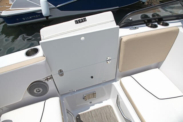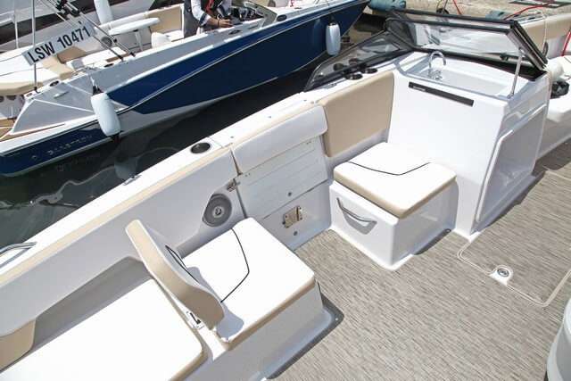 La proa es interesante porque delante no se cierra en ángulo, como es habitual en las bowrider, sino que mantiene cierta anchura con una plataforma en proa y la escala de baño integrada. Esto facilita la subida a bordo tanto desde el agua como desde el muelle. Bajo los dos sofás paralelos se esconden los correspondientes cofres de estiba. Se puede montar una mesa en el centro pero echamos en falta una roldana para el fondeo y un cofre para el ancla.