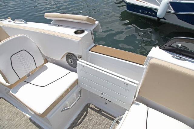 La bañera principal puede quedar rodeada totalmente por un sofá en forma de U, ocupando la banda de babor tras en puesto del piloto, la popa, y toda la banda de estribor. No es nada habitual, ya que el asiento del acompañante es un módulo fijo adosado al parabrisas, donde encontramos y un lavamanos. A media eslora a babor una puerta lateral abre totalmente la banda para facilitar el embarque. Aquí encontramos el herraje para montar el pie de la mesa de la diente que se puede formar en la bañera. No nos gusta el acabado con cantos vivos de aluminio del parabrisas cuando queda abierto, y falta un sistema de cierre para aislar la bañera de proa de la de popa. En todo caso el barco dispone de numerosos cofres bajo los asientos y uno alargado en el piso de la bañera para estivar los equís.