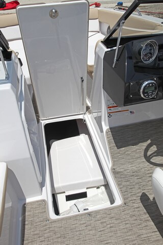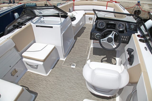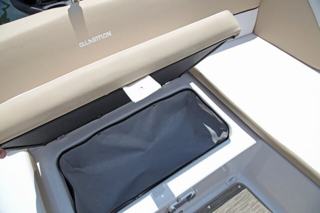 Los asientos monoplaza de las lanchas Glastron son ajustables y cómodos. En este modelo la palanca del Mercury Verado de 250 Hp está bien ubicada, en el costado con el pulsador del power trim integrado en la parte superior. Al volante uno se siente cómo y seguro cuando navega por encima de los 37 nudos de punta. Es un puesto deportivo con buena visibilidad, pero adolece, como ya hemos dicho en anteriores ocasiones, de un panel con indicadores de difícil lectura.