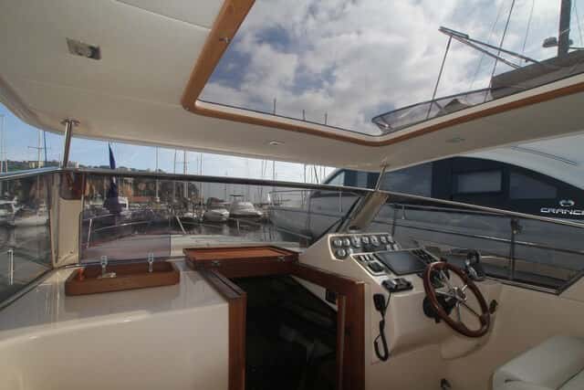 Puesto de la Gozzo Positano 38 muy bien diseñado, cómodo, y al que solamente se le podría añadir alguna guantera o red para depositar objetos personales y un punto de agarre en la misma consola.