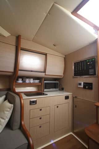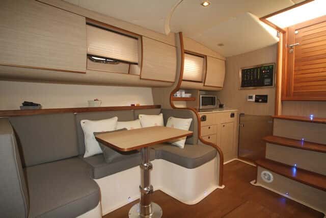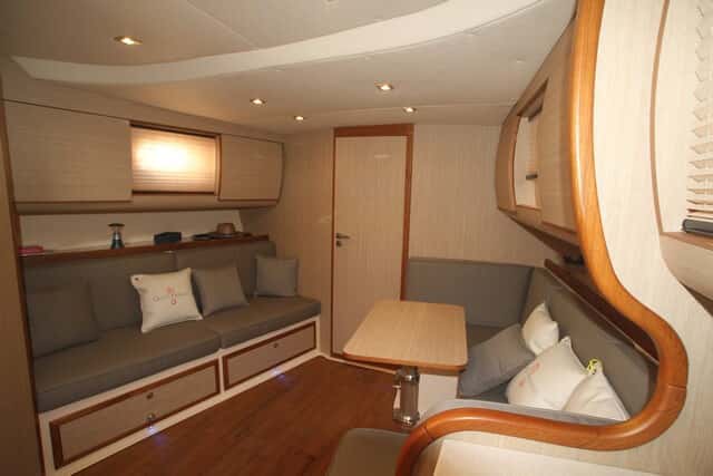 El espacio principal se dedica a la cocina y un salón cuyo sofá con la mesa se puede transformar en una segunda cama doble. El predominio de la madera mantiene el estilo tradicional del barco, bien combinado en colores y materiales, donde el gelcoat tiene un papel muy secundario para no perder la calidez del ambiente.