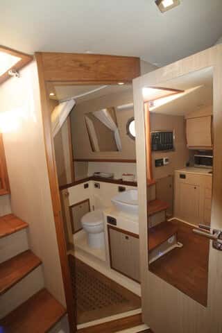 La primera sensación al bajar los tres escalones es la de entrar en un espacio agradable. Es una cabina voluminosa, sin excesos en sus medidas, con una distribución muy racional, nada abigarrada, en la que solamente hay dos espacios independientes, el aseo completo a babor, con inodoro, lavabo y ducha, bien equipado con armarios y bien ventilado; y la cabina de proa, con una cama de matrimonio, bien iluminada y ventilada gracias a la escotilla cenital.