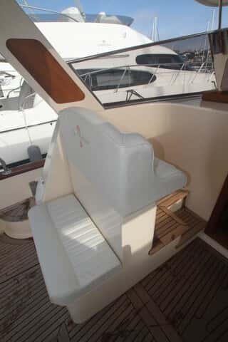 La timonera queda protegida por un hard top que se puede cerrar con respecto al parabrisas, dejando todo este espacio perfectamente protegido. En realidad, se puede considerar una timonera con perfecta aireación. El asiento del acompañante ofrece dos plazas, espalda contra espalda, con el de popa para completar la dinete de la bañera.