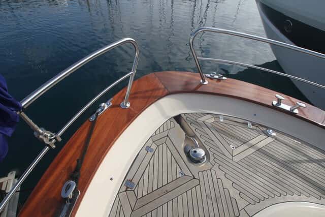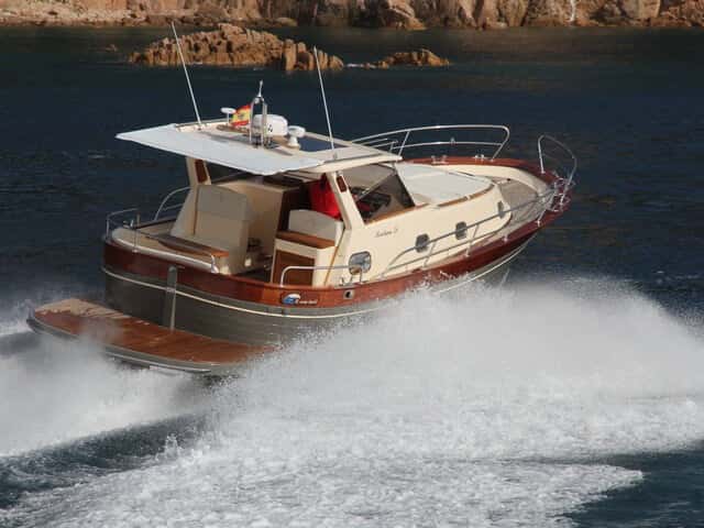 La configuración de este gozzo es clásica, dejando la proa libre para ubicar un estupendo solárium sobre el techo de la cabina, cuyas colchonetas levantan los cabezales, y dotada de una buena maniobra de fondo. Los pasamanos altos y la anchura de los pasos laterales ofrecen la seguridad exigible para desplazarse cuando se navega.