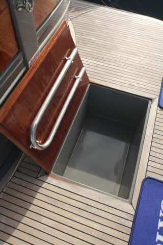 La zona de popa de la Gozzo Positano 38 llama la atención por la gran plataforma integrada, con un cofre para las gafas, aletas, etc. Tiene puerta de acceso directo y la bañera queda ocupada por un sofá en semicírculo que se completa con una mesa de teca de doble ala, grande y robusta. El mueble de cocina, tras el asiento del piloto dispone de nevera y fregadero, y puede añadir una parrilla o fogones.