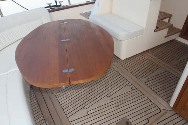 El espacio principal se dedica a la cocina y un salón cuyo sofá con la mesa se puede transformar en una segunda cama doble. El predominio de la madera mantiene el estilo tradicional del barco, bien combinado en colores y materiales, donde el gelcoat tiene un papel muy secundario para no perder la calidez del ambiente.