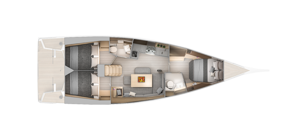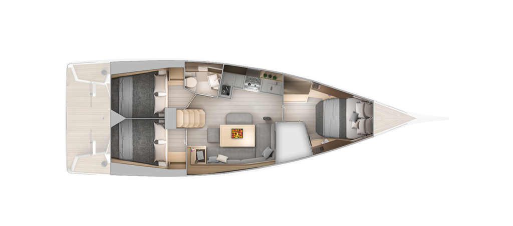 La cabina principal en proa incluye un amplio volumen de estiba y es luminosa; aunque solo recibe luz cenital de la escotilla que da a la cubierta de proa. En cambio, las dos cabinas de popa cuentan con luz natural de las ventanas de casco y dos escotillas que dan al lateral de la bañera.