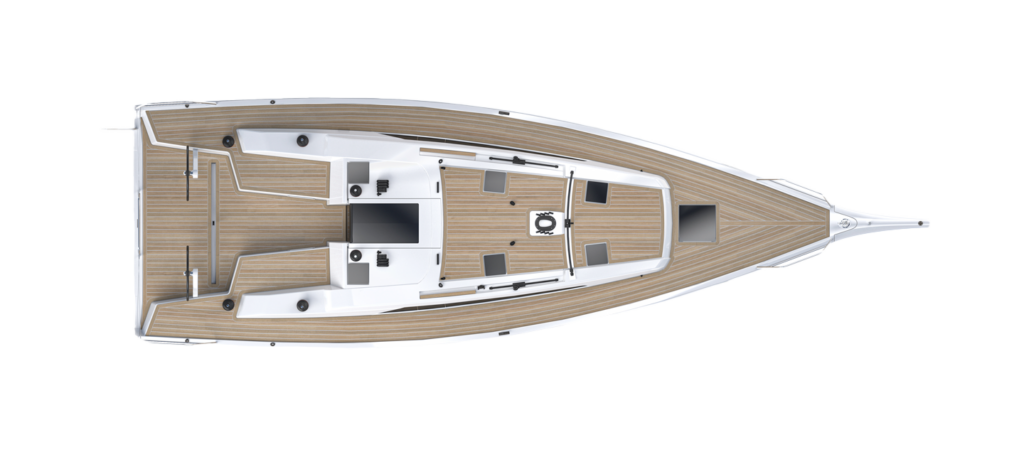 Otro de los anexos son los carrilles de escota sobre la caseta destinados a la escota del génova, que no tiene un gran solape con la mayor, pero sí se ha buscado ampliar la J al posicionar el palo más a popa, por lo que la vela de proa ha ganado superficie. En la versión Performance, la vela de proa es autovirante con un carril que es opcional en la versión Race, pero sin duda es muy cómodo en la navegación de crucero o con tripulación reducida, y evidentemente mucho más en solitario.