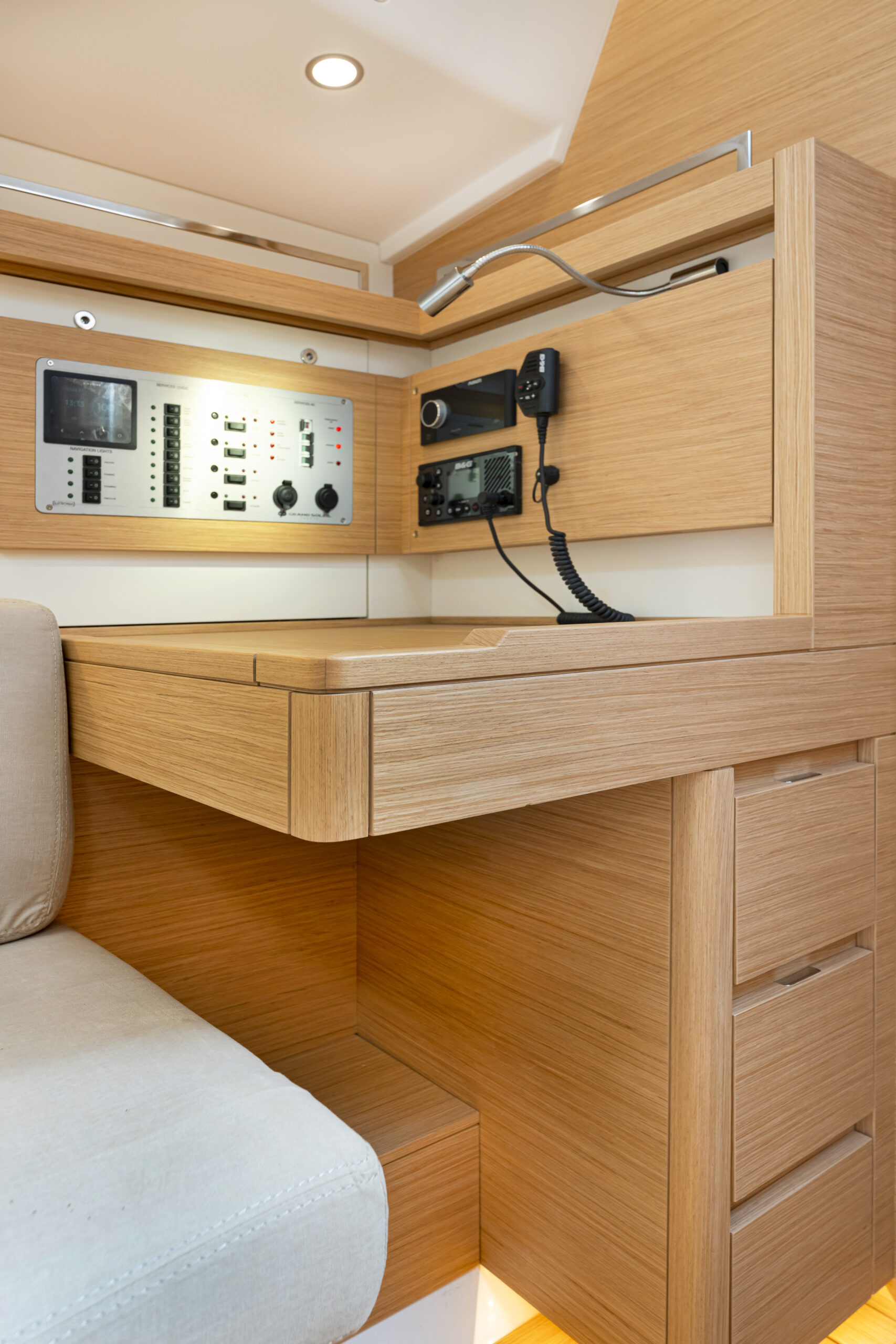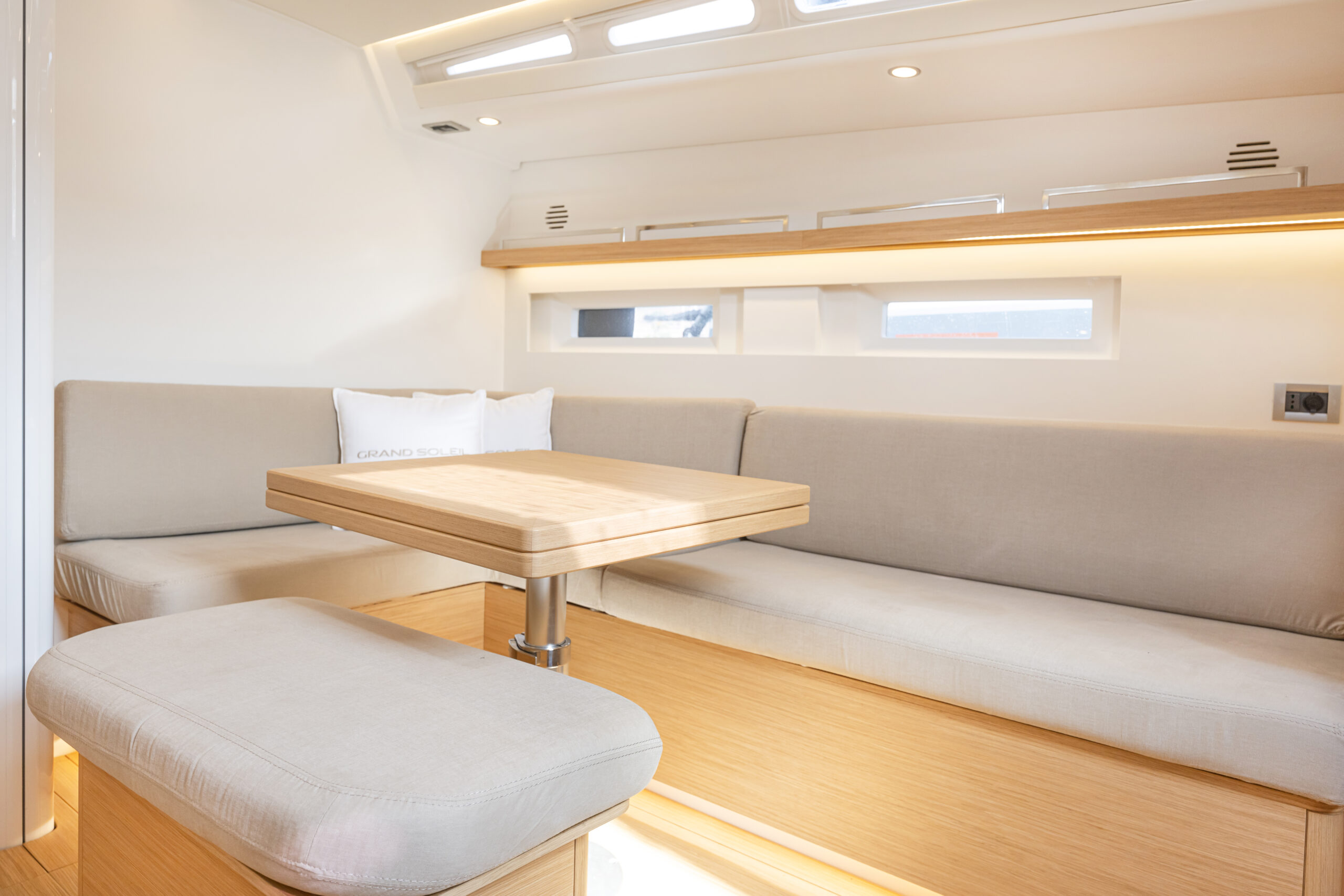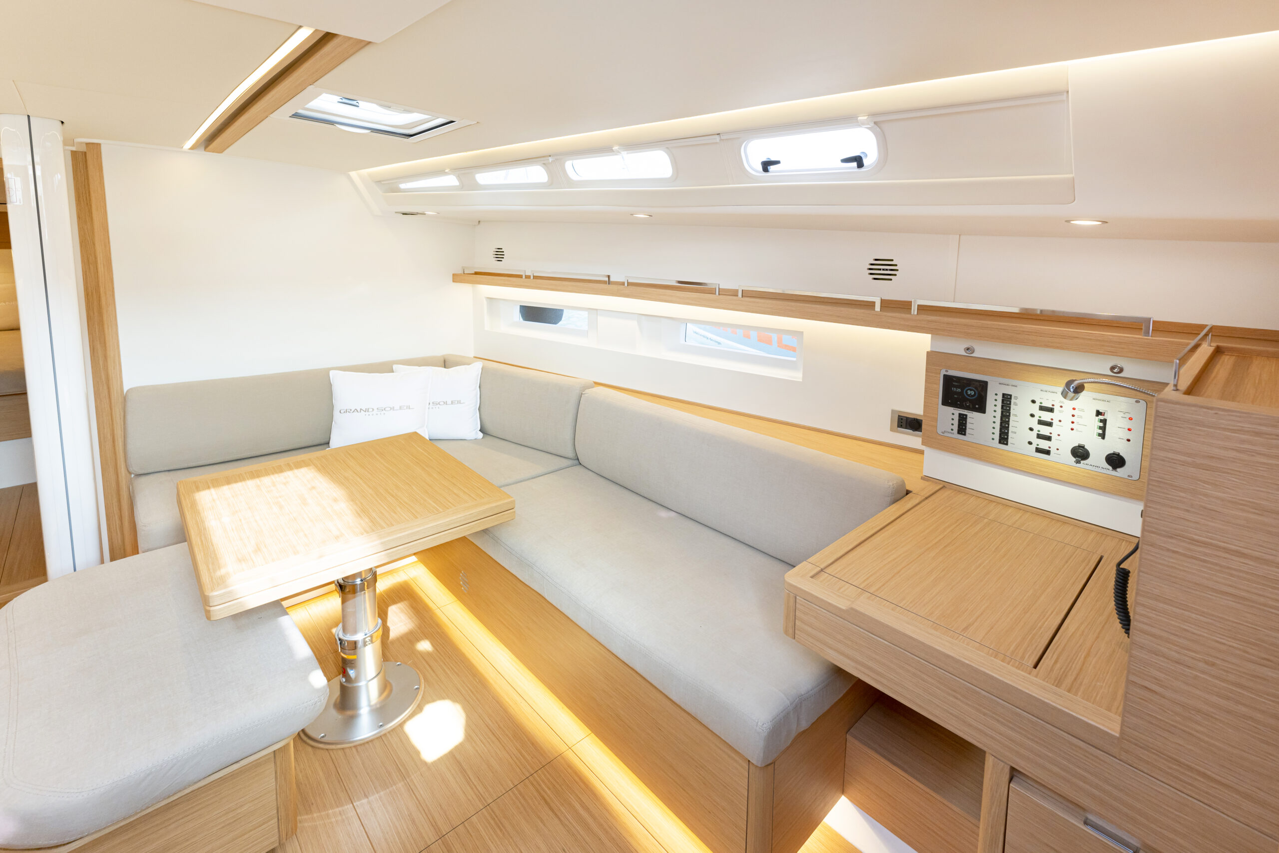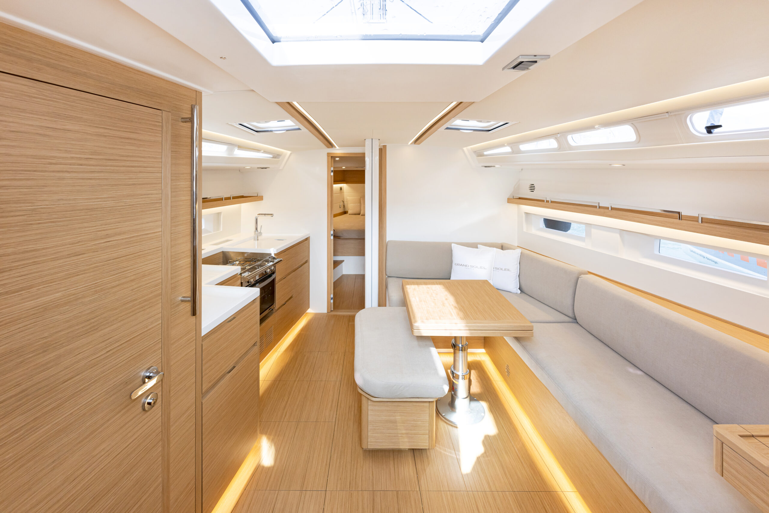 Al incorporar la cocina al salón ocupando una banda, rompe con la simetría, solo queda en crujía un taburete largo delante de la mesa. Es un salón pensado para disfrutar en una cala, Adelanta la cocina en la eslora, hacia un punto de menor movimiento y la enfrenta a un gran sofá. La cocina gana en superficie de trabajo y el sofá en longitud. La funcionalidad se mantiene porque el pasillo que conecta con proa sigue liberado y porque al bajar la escalera sitúa a babor un lavabo, en el que se puede dejar el traje de agua antes de ir a la mesa de navegación situada al pie de la escalera, a estribor, pero usa de asiento el extremo del sofá por lo que la persona mira hacia popa. La elección de colores claros para el interior refleja la abundante luz que entra por las ventanas de casco, las de la caseta y las cenitales.