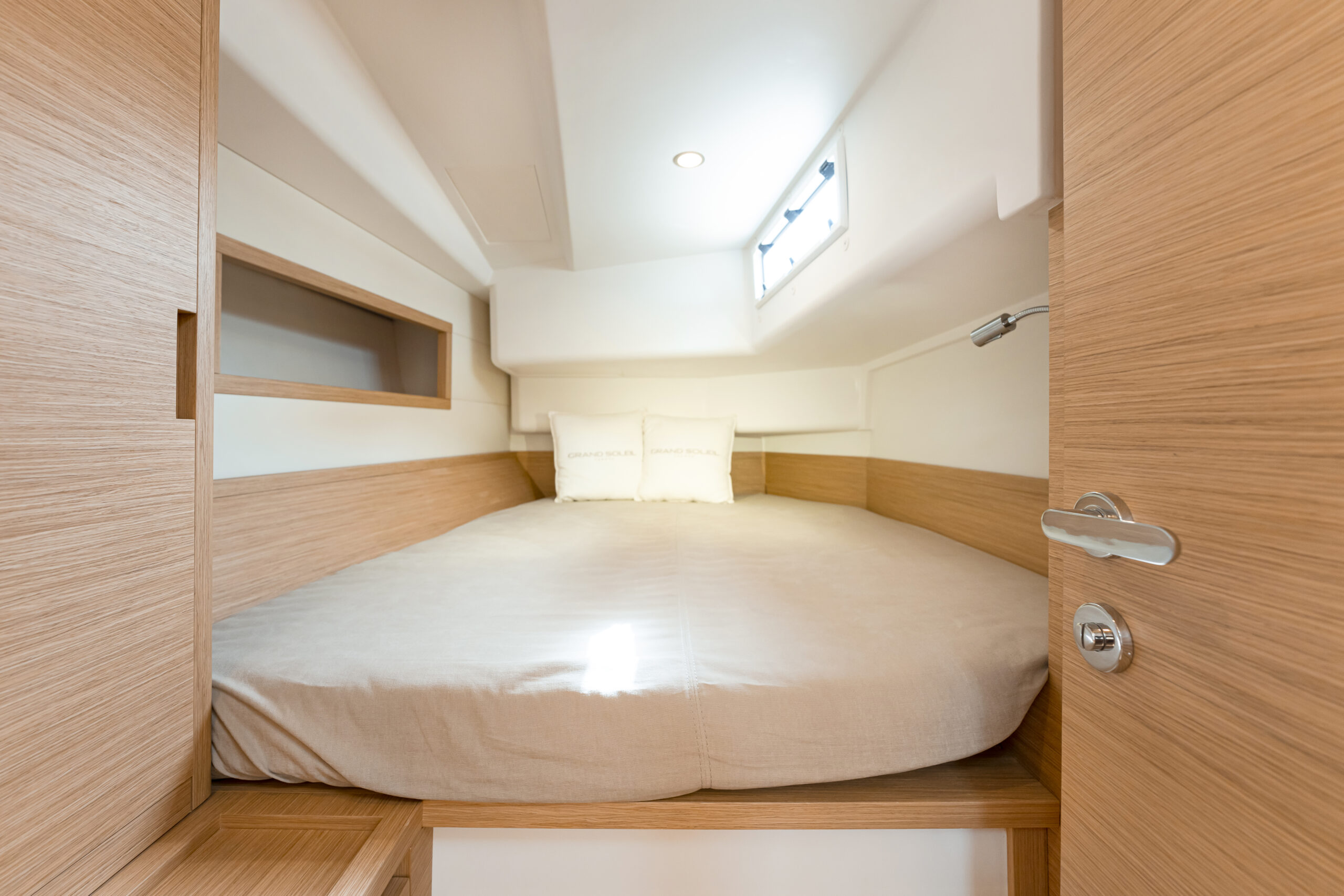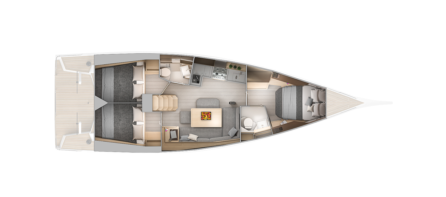 La cabina principal en proa incluye un amplio volumen de estiba y es luminosa; aunque solo recibe luz cenital de la escotilla que da a la cubierta de proa. En cambio, las dos cabinas de popa cuentan con luz natural de las ventanas de casco y dos escotillas que dan al lateral de la bañera.