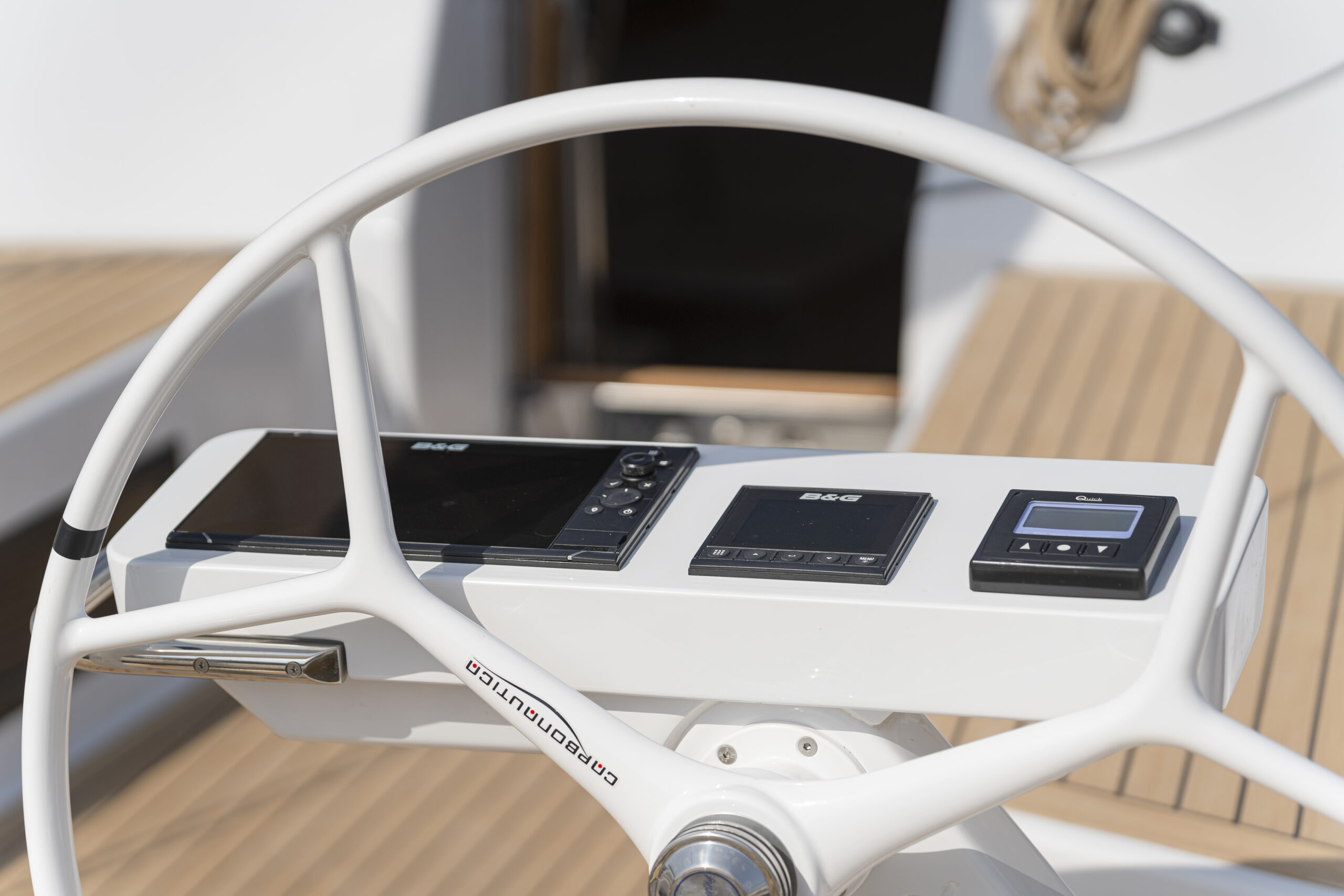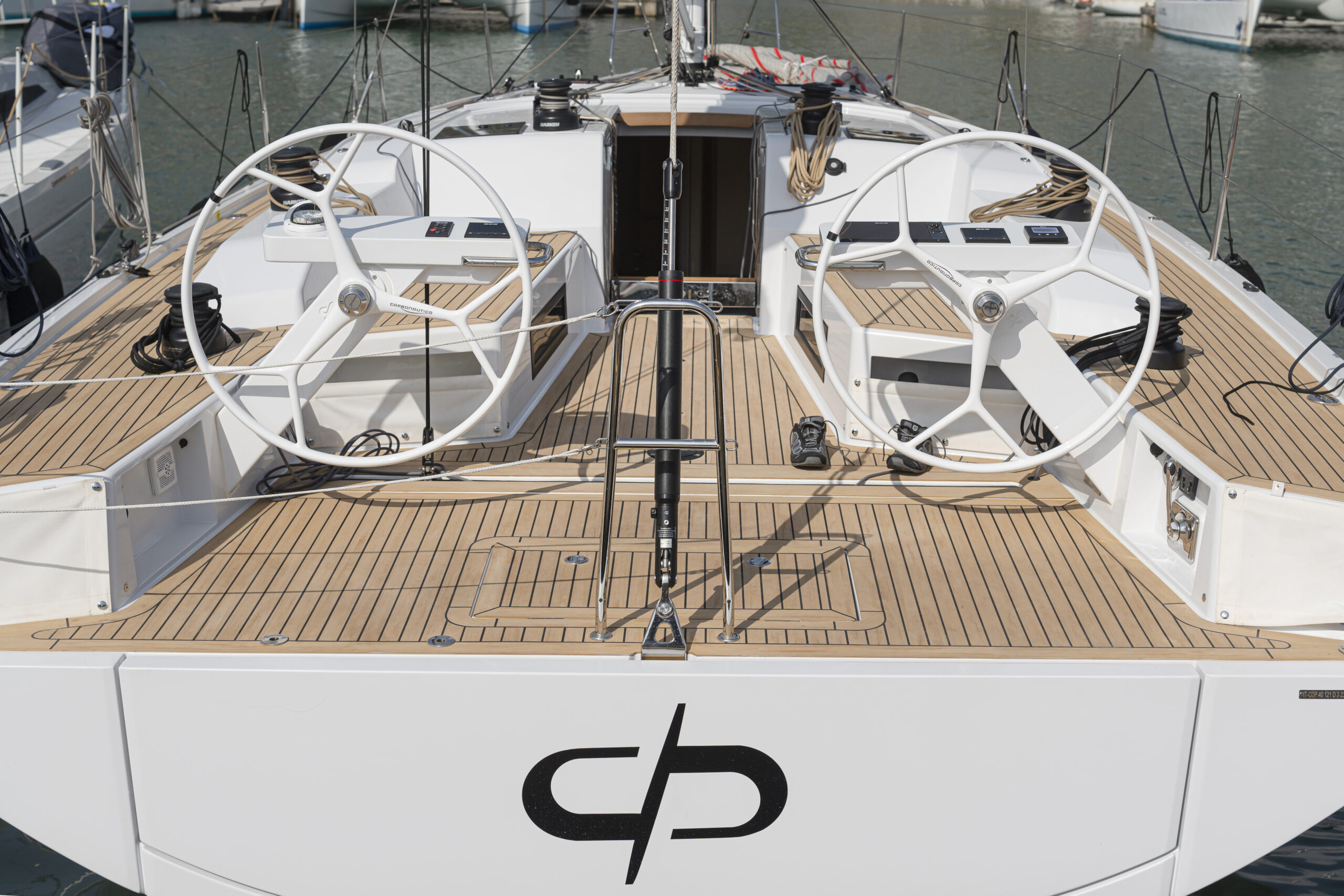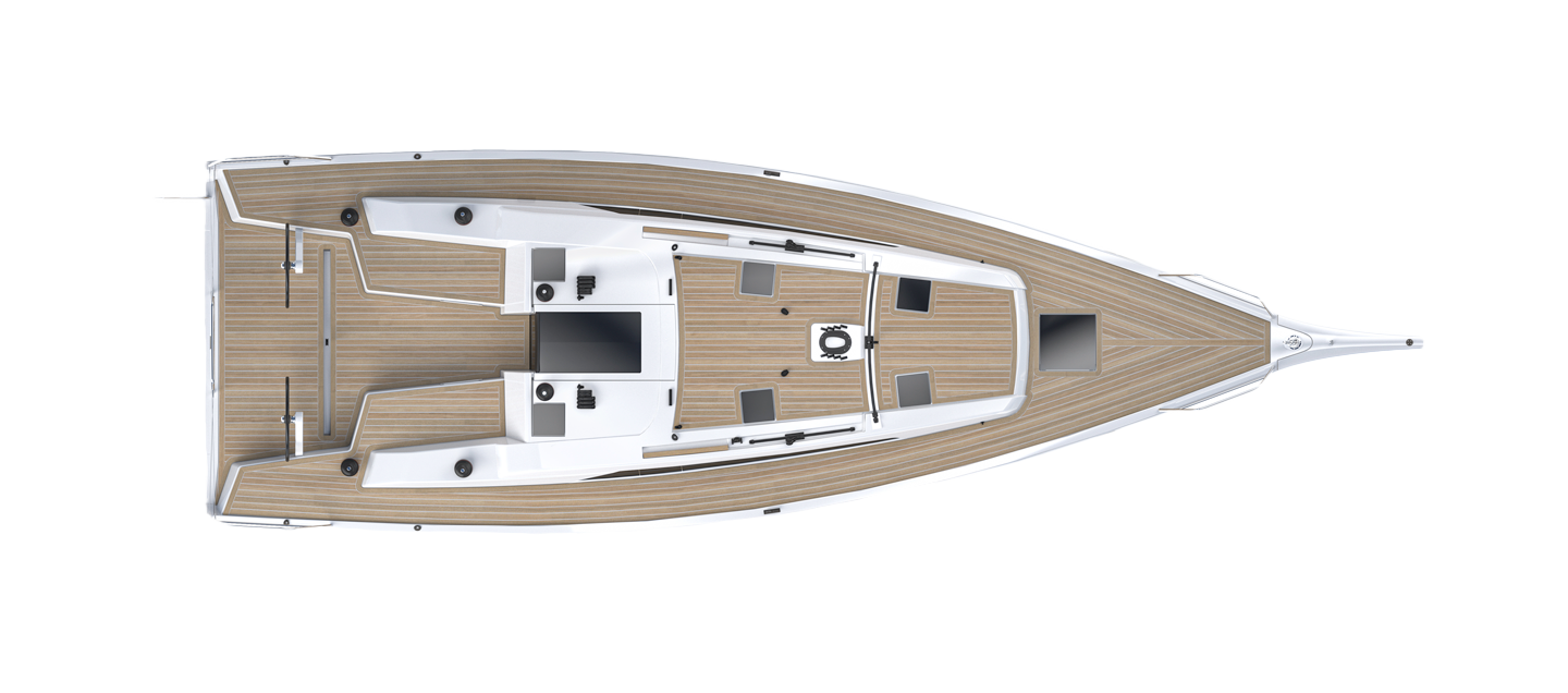 La posición al timón es cómoda, bien a barlovento, con buena visibilidad de las velas de proa y con los principales controles al alcance de la mano para navegar de crucero. El carro de escota enrasado permite despejar el suelo de la bañera.