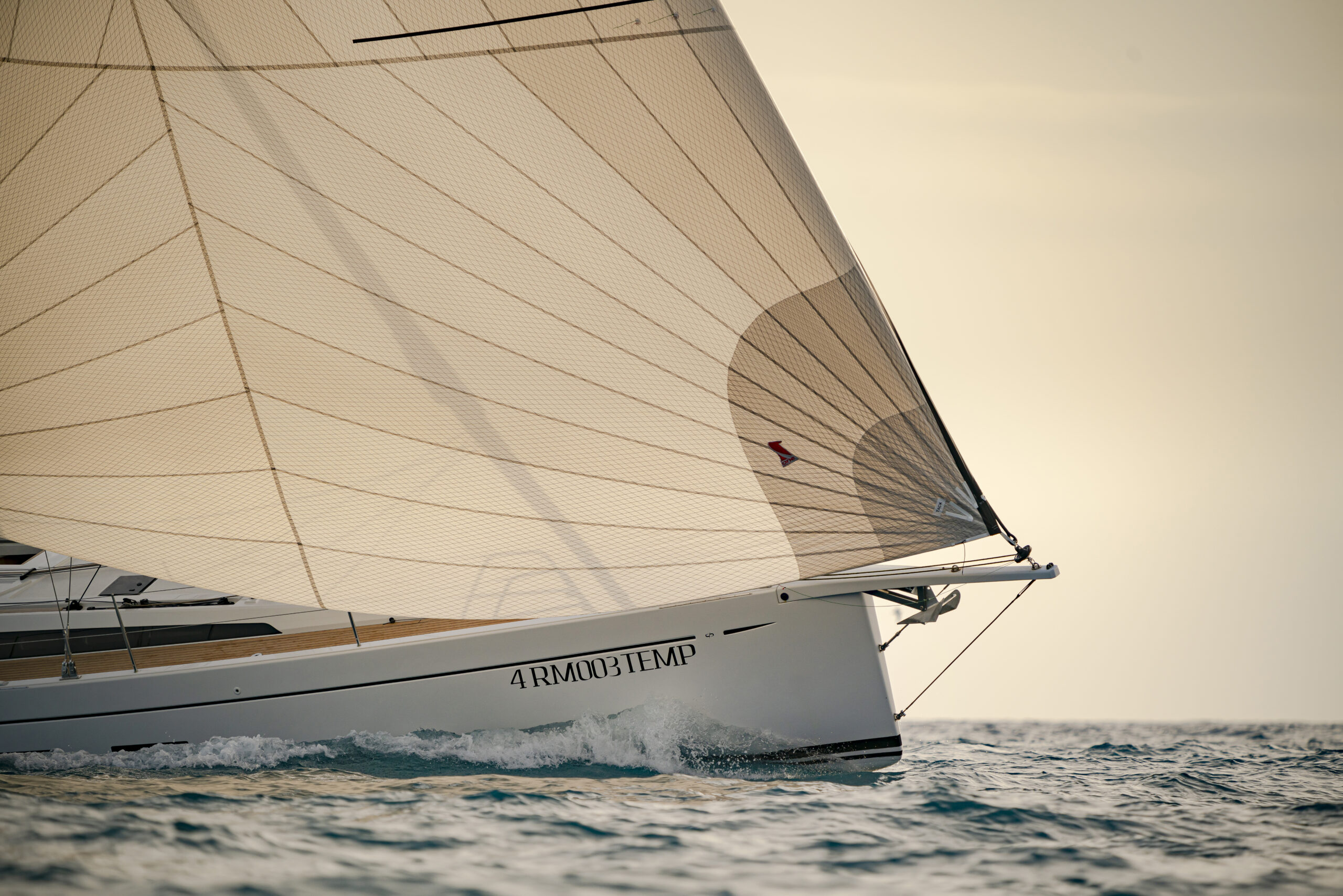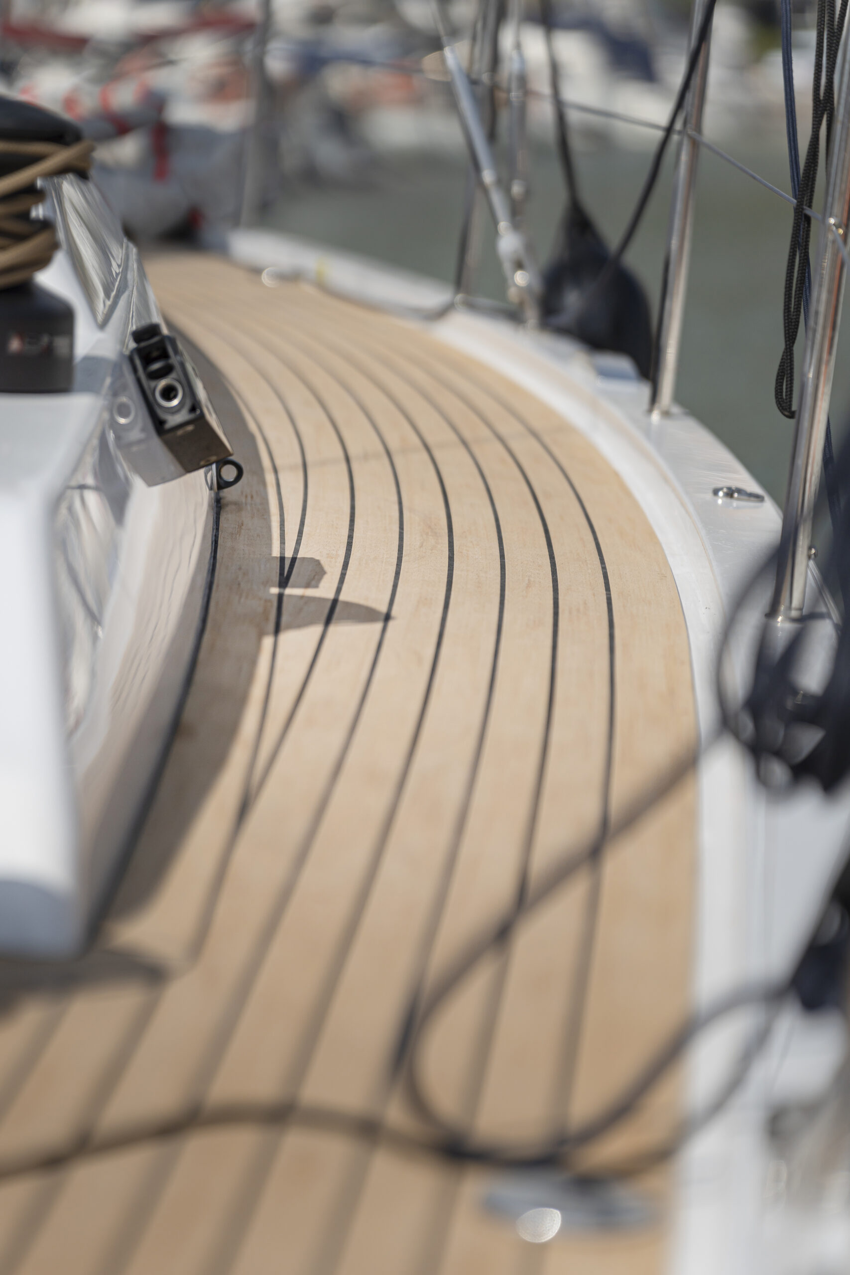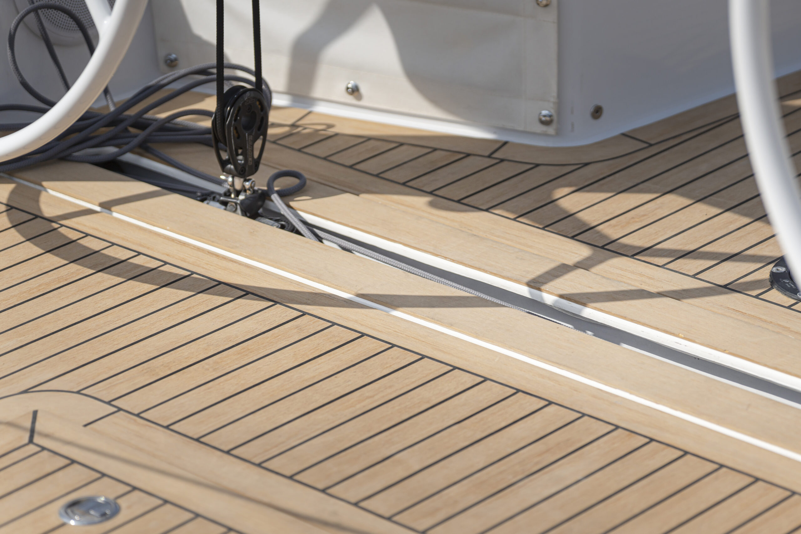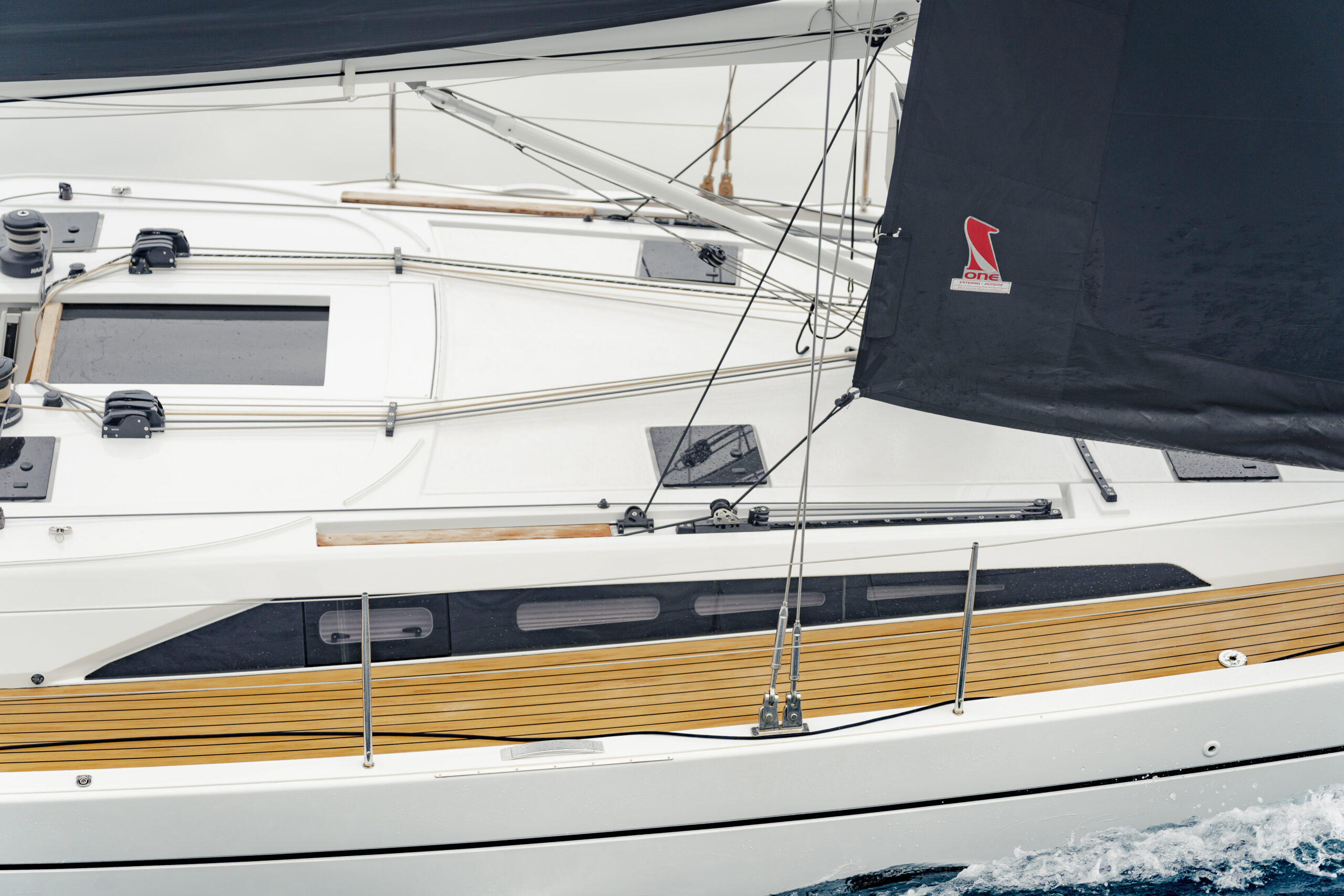 Otro de los anexos son los carrilles de escota sobre la caseta destinados a la escota del génova, que no tiene un gran solape con la mayor, pero sí se ha buscado ampliar la J al posicionar el palo más a popa, por lo que la vela de proa ha ganado superficie. En la versión Performance, la vela de proa es autovirante con un carril que es opcional en la versión Race, pero sin duda es muy cómodo en la navegación de crucero o con tripulación reducida, y evidentemente mucho más en solitario.