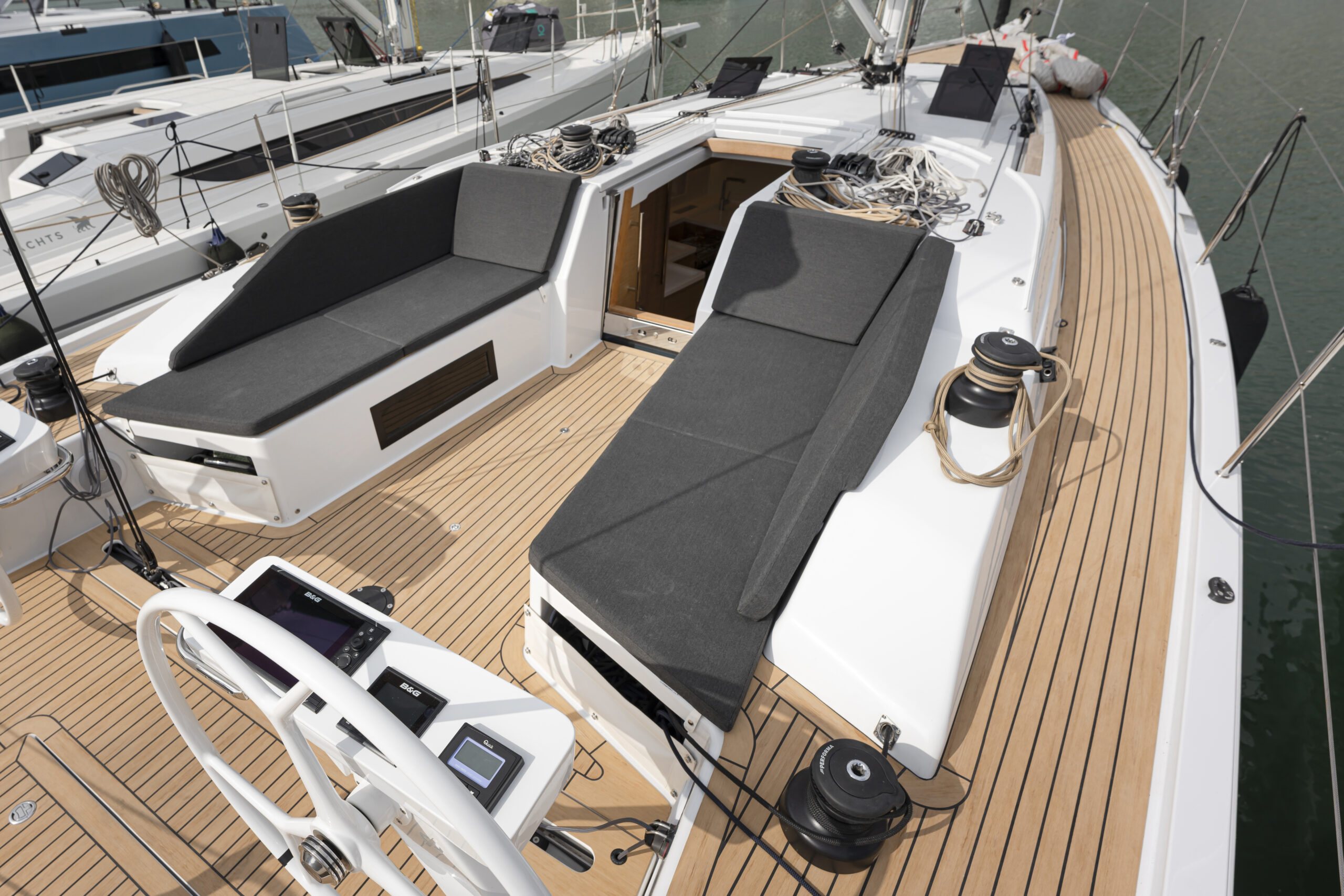 También diseñaron la estética exterior que se refleja en líneas deportivas que combinan con las líneas cómodas que exige la navegación de crucero. Los asientos de la bañera son un claro ejemplo de este equilibrio, cumplen con la ergonomía adecuada a la hora de maniobrar en regata, mientras que en navegación de crucero se convierten en el sitio más acolchado y con mejores vistas del barco.
