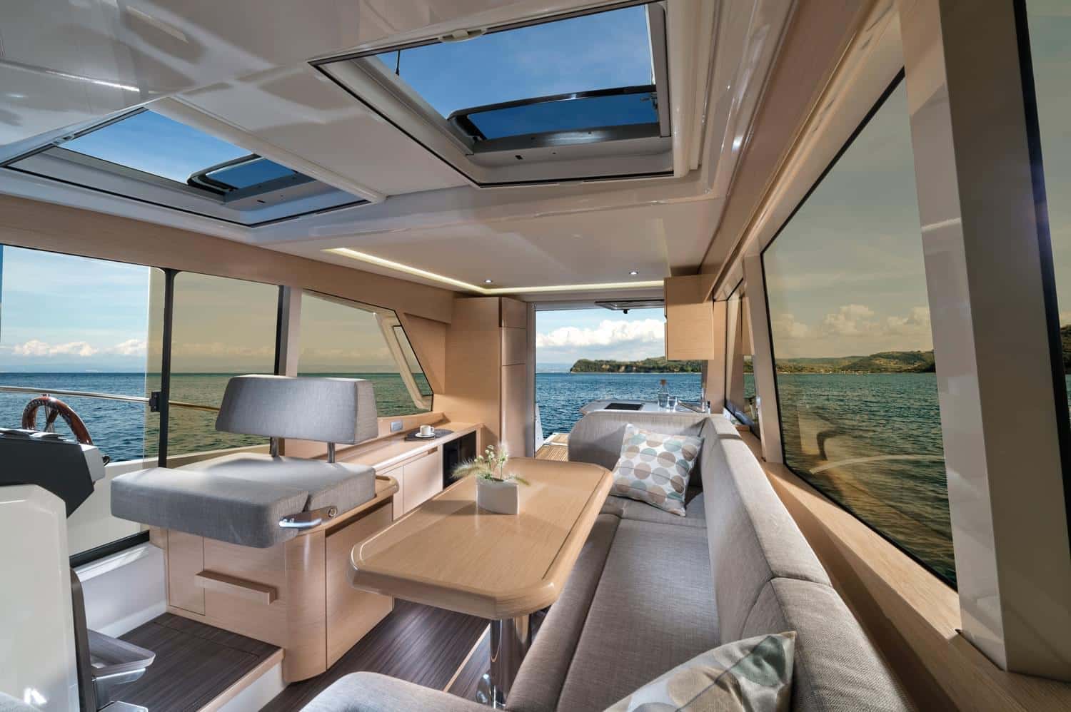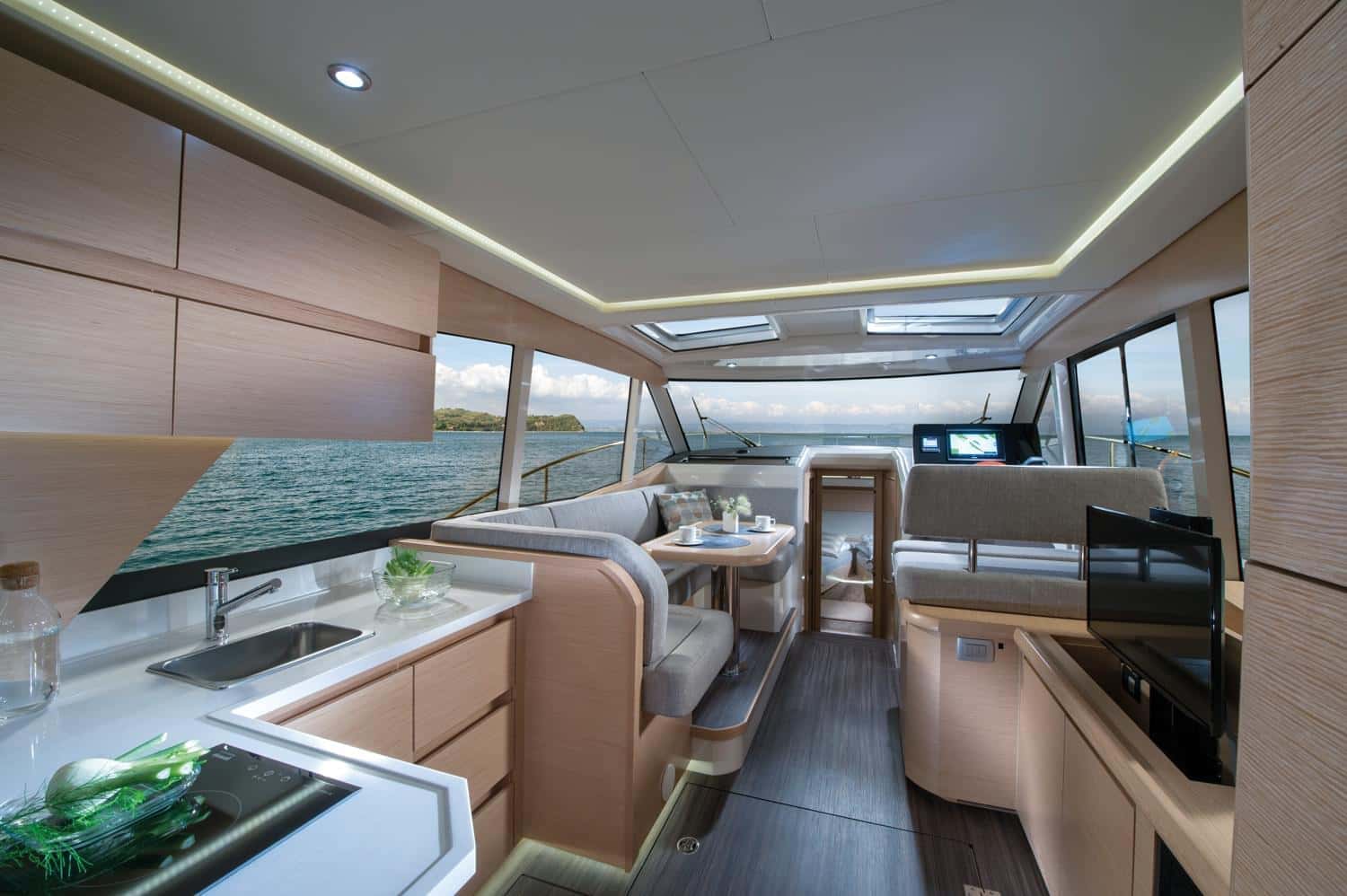 En el salón dispone de una cocina en L, dinete y puesto de gobierno con acceso lateral, mientras que abajo habilita dos cabinas dobles y un baño.