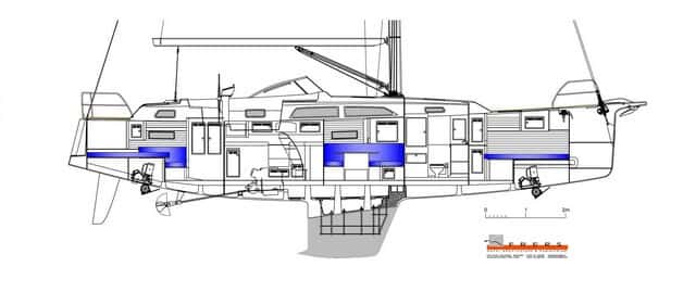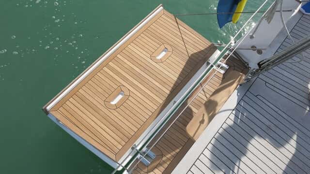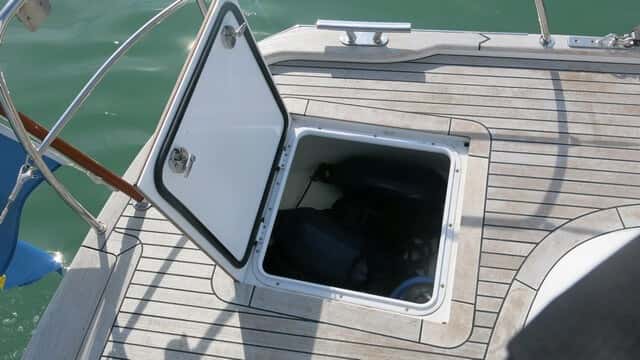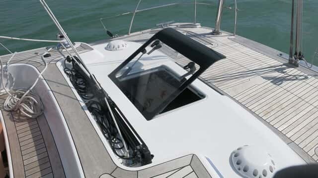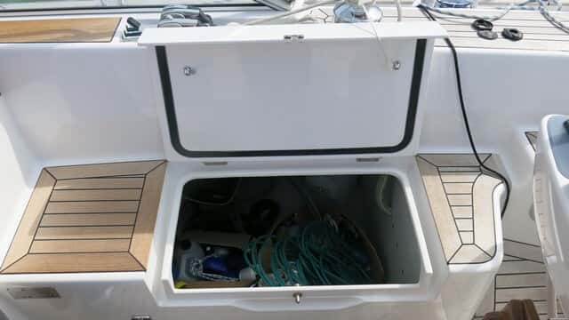 Destaca el gran espacio que uno tiene para pasear por cubierta. En la zona de popa, tras la bañera, queda una gran superficie para relajarse en cubierta, muy bien aprovechada desde el punto de vista de la estiba, ya que hay dos grandes cofres a cada lado.