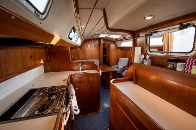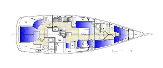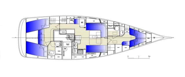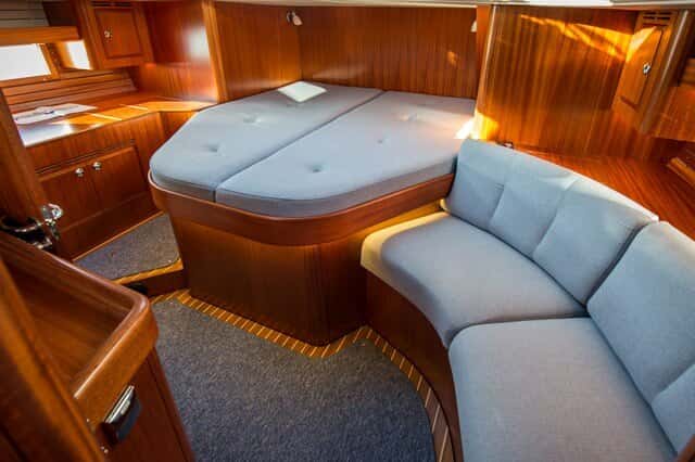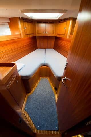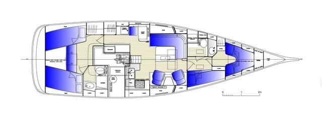 A nivel de distribución, hay muchas opciones. Por ejemplo, el que nosotros probamos constaba de una cabina principal en popa con baño privado, con espacio e iluminación digna de un hotel de cinco estrellas, la cocina en forma de U en la banda de babor, un salón central, con mesa a babor y dos butacas a estribor, y dos cabinas en proa, una con dos literas y otra con cama doble, con baño compartido. Esta opción quita algo de capacidad de almacenamiento, ya que un espacio teóricamente reservado para dos armarios pasa a ser una litera.