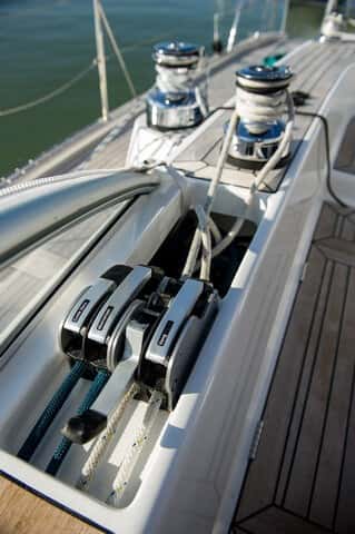 La maniobra está reenviada a la bañera por la banda de estribor, escondida bajo la cubierta hasta llegar a las mordazas. Los cabos sobrantes se pueden guardar en los cofres destinados a ellos, con lo que nos evitaremos tener cabos sueltos en la bañera.