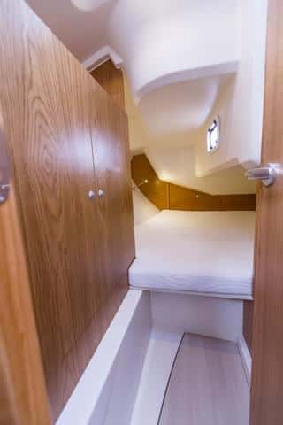 La cabina de proa puede ser con mamparo abierto y cama ocupando todo el triángulo, que es la versión de serie, o cerrada,en cuyo casohay que abonar un suplemento. En esta opción se incluye un armario en lugar de estanterías y un pequeño asiento.