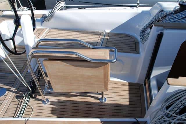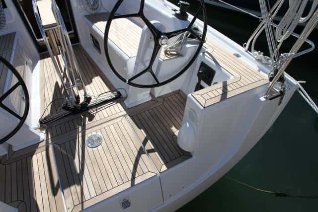 El diámetro de las ruedas y las banquetas que cierran el balcón de popa permiten una buena posición sentados al timón, mientras que el winche frente a éste, bien al alcance de la mano, permiten controlar el trimado de la mayor sin moverse. La escota llega hasta el winche reenviado por un cáncamo en el pasavante, mientras que la escota del foque autovirante se reenvía por el interior del palo hasta el piano.