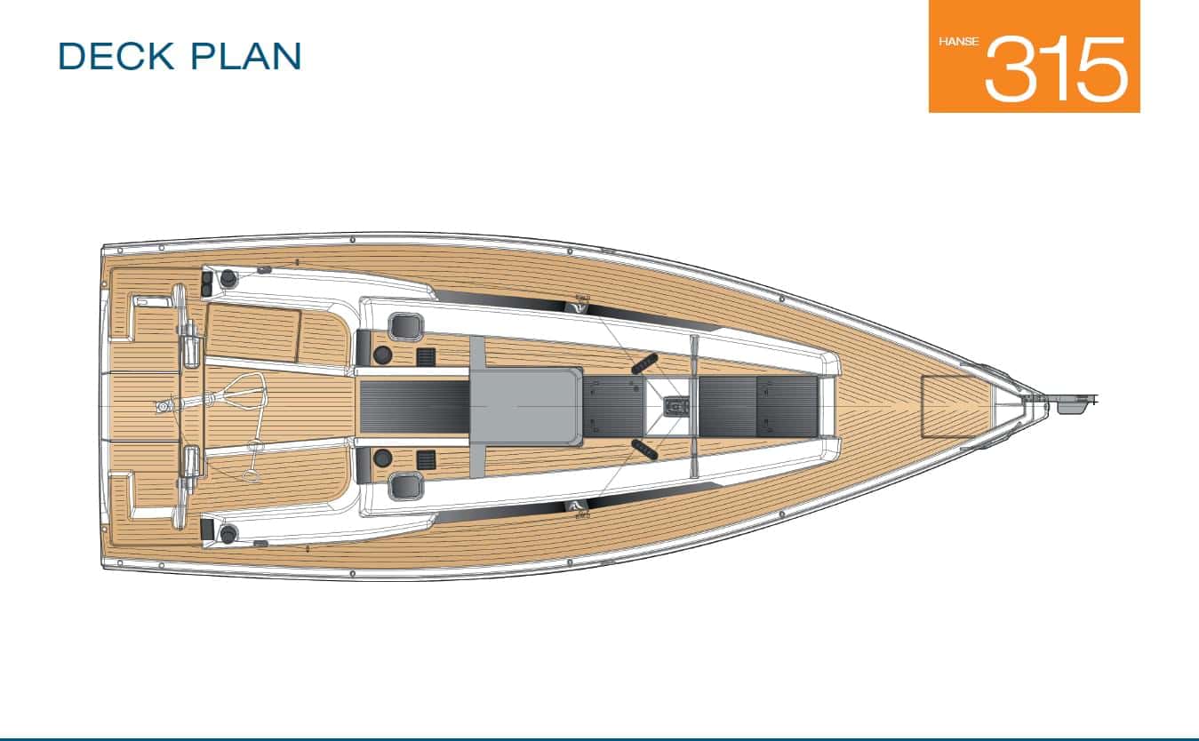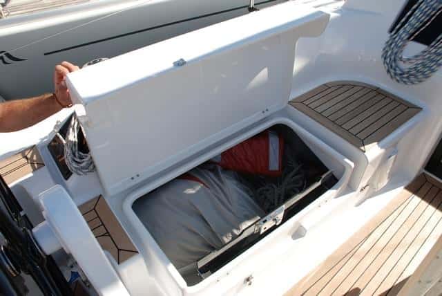 La unidad en que navegamos, dotada con doble rueda de carbono —la versión de serie es con caña—, ofrece una bañera amplia y con buena capacidad de estiba en un largo cofre a la banda de babor. La inclinación de las brazolas y de los laterales del tambucho brinda comodidad tanto sentados como para descansar tumbados, posición que permite la longitud de las bancadas, que llegan hasta los pedestales de las ruedas. Esta extensión, sin embargo, no consiente un carro de escota de mayor a toda la manga —de hecho el carro de escota de mayor es un extra— por lo que el Hanse 315 puede dotarse como en las dos unidades que probamos de uno más corto, pero suficiente para poder jugar con el trimado de la mayor.