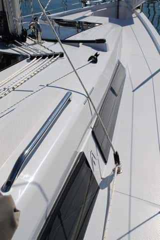 Aunque se entrega de serie con una configuración de mayor y foque autovirante Elvström con enrollador Furlex, la primera unidad en que navegamos equipaba un enrollador Seldén y gennaquer montado sobre la roldana de inox de proa que dispone también de un útil peldaño de teca. El pack gennaker es opcional y el astillero ofrece otros paquetes bajo la denominación Performance que permiten incrementar si cabe las ya de por sí excelentes prestaciones de este diseño de Judel/Vrolijk con casco en formas, roda vertical para maximizar tanto el espacio interior como la eslora dinámica, y dos posibilidades de quilla: en L larga de 1,85 metros y corta de 1,37 metros.