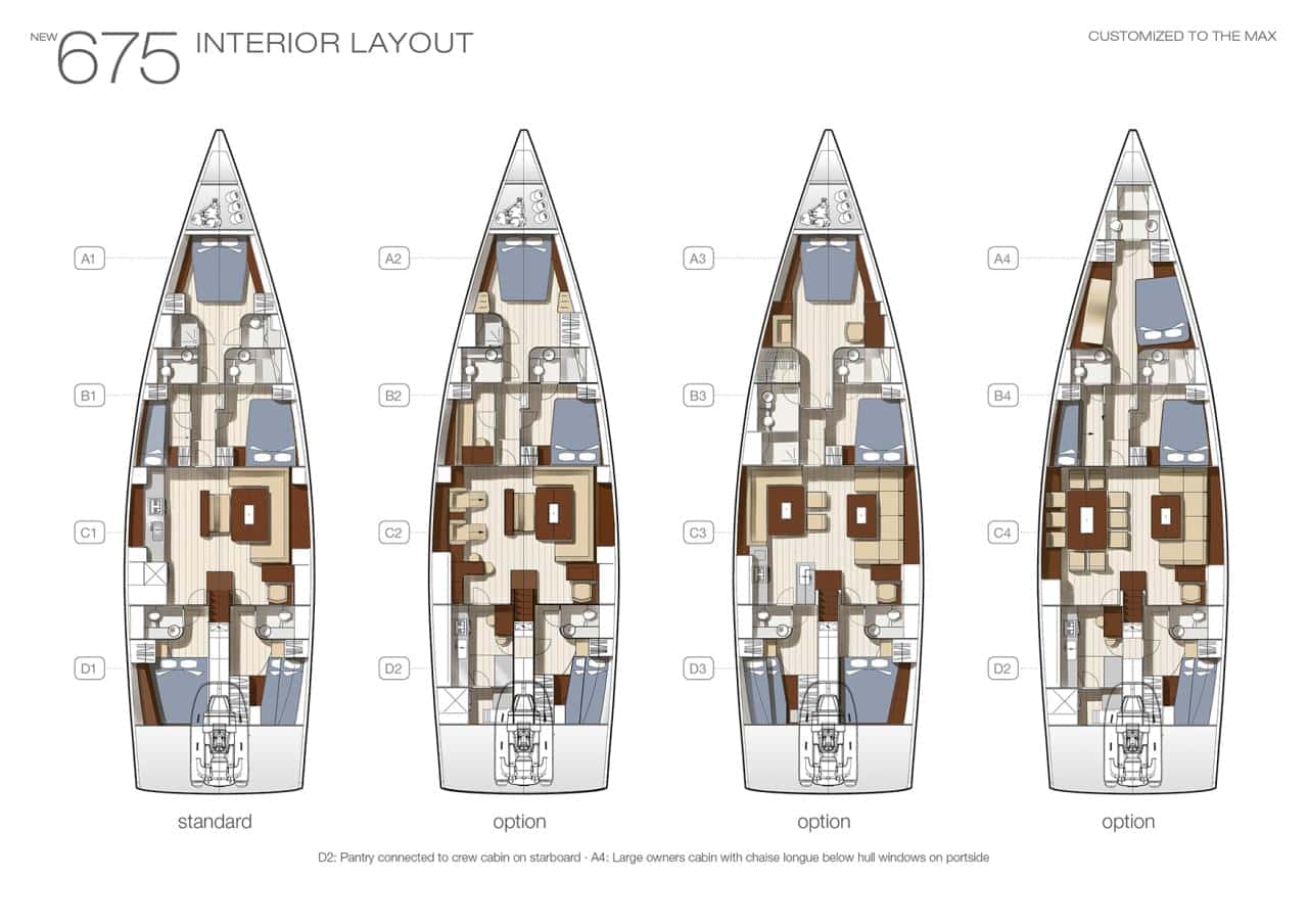 El nuevo modelo mantiene el garaje de popa que ya ofrecía su predecesor, adopta la configuración de foque autovirante y, como aquel, sitúa también los winches junto al timonel de forma que una sola persona pueda manejarlos.