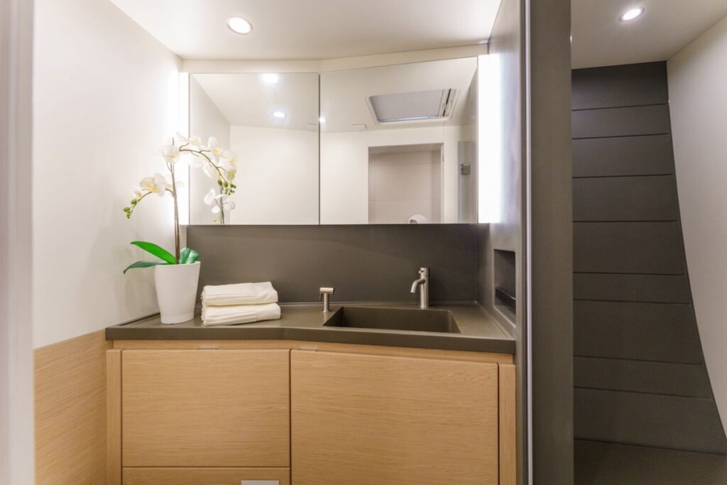 Esta primera unidad está construida con un casco de sándwich de fibra de vidrio y carbono y una cubierta completamente en fibra de carbono, aprovechando al máximo las propiedades de este material que asegura una gran rigidez y mantiene las vibraciones y, por ende el ruido a bordo, en niveles mínimos. Anticipándose a las necesidades de todos los armadores, el astillero ya está trabajando en un diseño completamente en carbono.