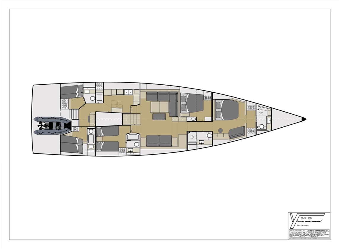 La distribución de la cubierta del ICE 80 Blue Water Sport refleja la esencia de un auténtico superyate. Destacan dos amplias bañeras: una muy espaciosa a proa, destinada a los invitados, y otra a popa, que ofrece todo el espacio necesario para realizar las maniobras con total comodidad. La caseta, de perfil bajo y elegante, resulta también muy funcional al proporcionar una visibilidad excepcional. En línea con las características típicas de una embarcación de gran eslora, dos amplios pasillos permiten un acceso cómodo a proa, mientras que en la popa se encuentra una espaciosa plataforma de baño, así como un generoso garaje capaz de albergar una auxiliar de hasta 3,5 metros.