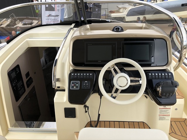 Es unas de las partes más atractivas de esta embarcación, por sus formas, equipamiento, estilo y ergonomía. El asiento del piloto tiene la base plegable, igual que el del acompañante, que tiene como punto de agarre la parte lateral baja del perfil del parabrisas, que se separa el cristal. La consola es de diseño, con las palancas electrónicas de Volvo Penta, bien ubicadas a estribor, que permiten manejar fácilmente el trim.