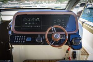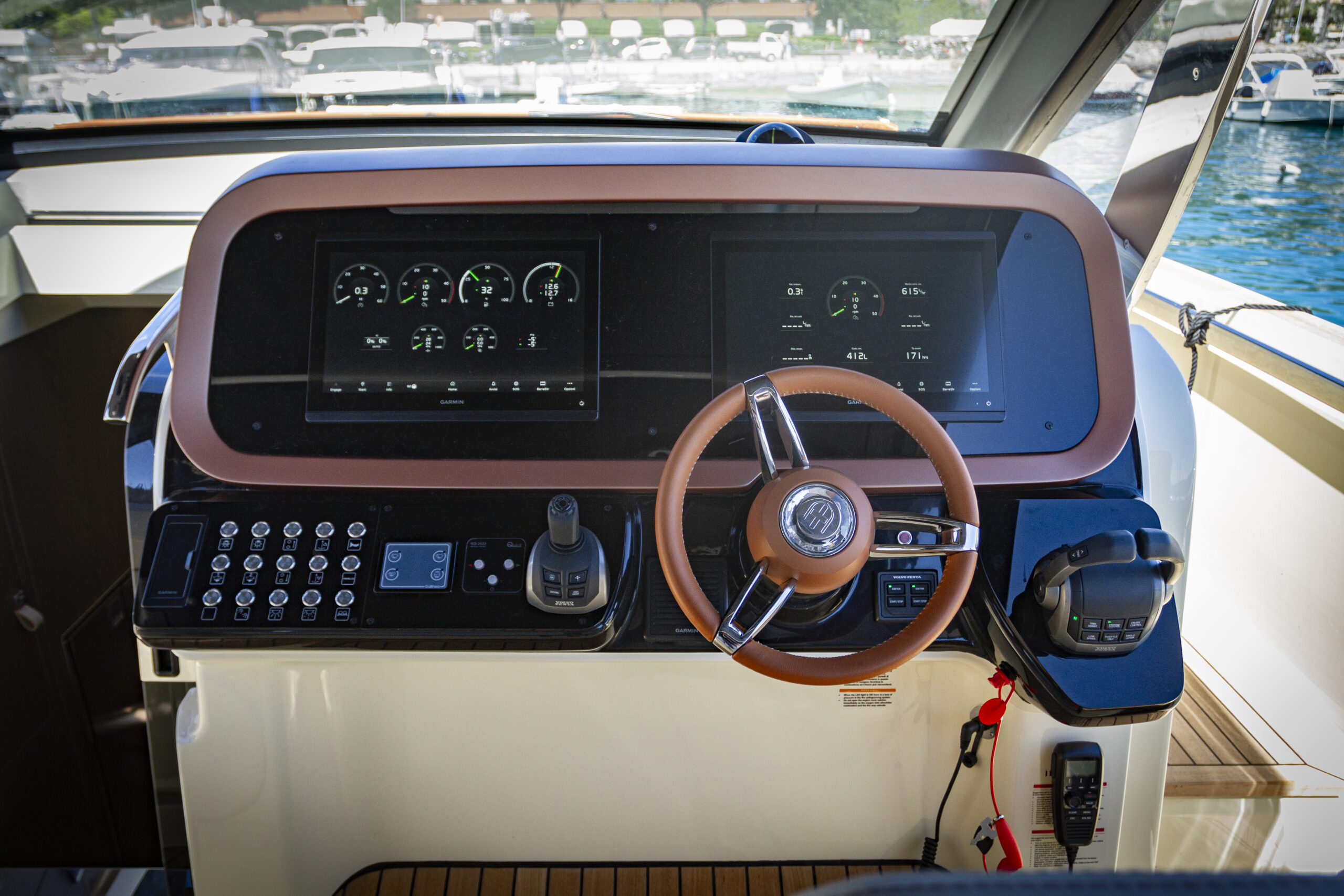 El puesto de mando tiene tres asientos, pero el timón está enfrentado al primero de estribor, una solución inteligente considerando que quien esté al mando tenga la posibilidad inmediata de salir al pasillo lateral o asomarse a la borda. La disposición tiene muy en cuenta la ergonomía de la posición de gobierno, particularmente en los mandos del acelerador, ligeramente elevados y más próximos al cuerpo para poder ser accionados manteniendo equidistancia. El conjunto ergonómico se completa con un reposapiés y la posición del asiento que permite pilotar de pie, con sujeción lumbar o sentado con los pies firmemente apoyados para mantener una sólida posición en caso de un bandazo.