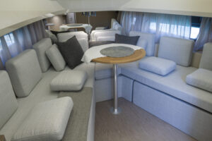 El estilo de líneas rectas, sobrio y luminoso, se repite en el interior. Al descender los cuatro escalones que separan de la cubierta encontraremos el salón que se distribuye con un asiento en forma de V hacia proa y una mesa redonda central que facilita la circulación. Las ventanas practicadas en el casco dejan paso a la luz natural y permiten mirar al exterior ya que están dispuestas a la altura de la vista de las personas sentadas. Por supuesto que es posible retirar la mesa y completar el área para convertirla en una cama doble de generosas dimensiones.